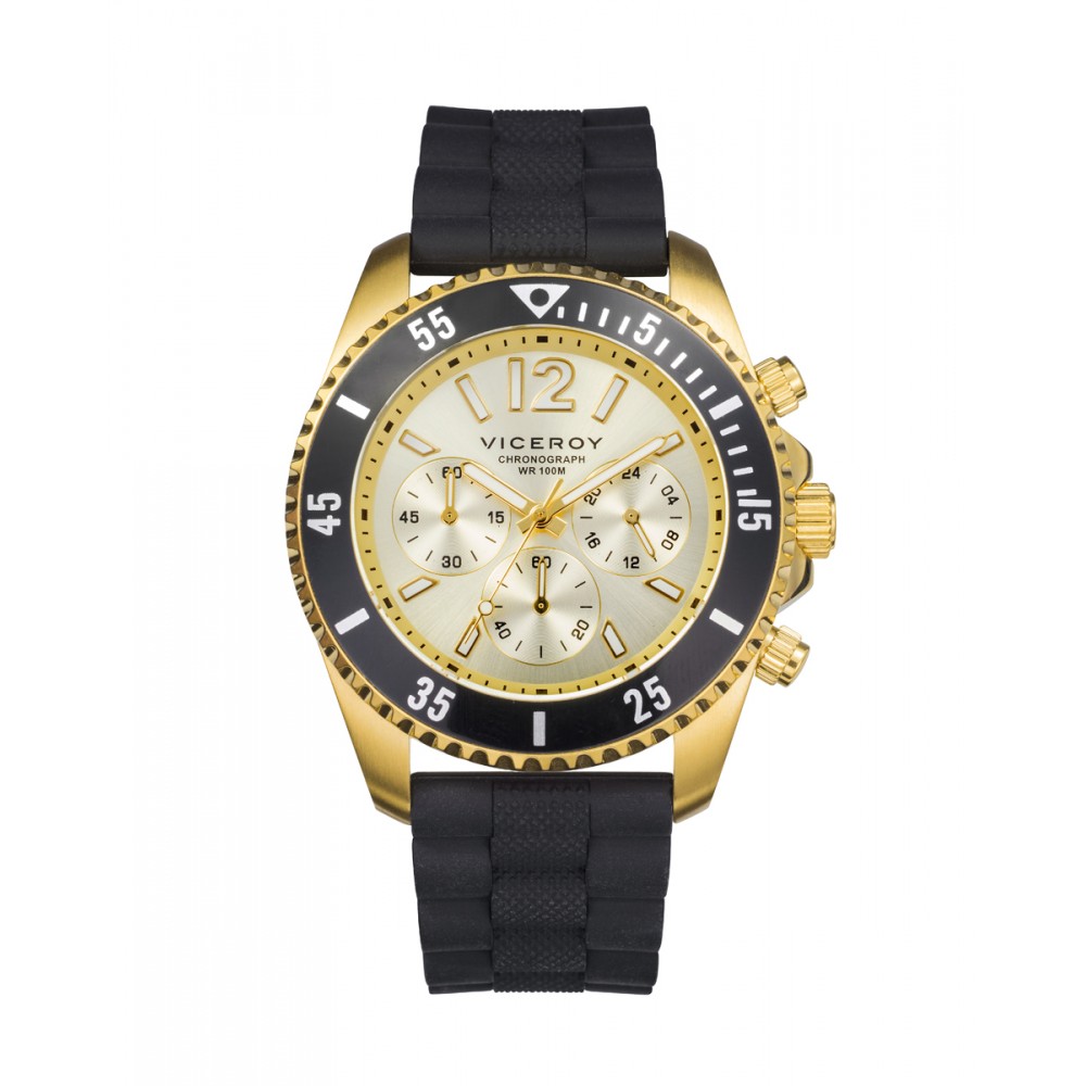 Este reloj de hombre Viceroy Heat cronógrafo es una fusión impresionante de estilo y funcionalidad. Con una caja de acero con IP dorado y un bisel en negro, este reloj emana un aura de lujo y elegancia. Su esfera en dorado resalta los índices en blanco, proporcionando una lectura clara y nítida del tiempo. Los contadores ubicados a las 3, 6 y 9 añaden una funcionalidad adicional, ideal para medir intervalos de tiempo. La correa de silicona negra asegura comodidad y durabilidad. Ya sea para eventos formales o para un estilo más casual, el Viceroy Heat cronógrafo es el compañero perfecto para el hombre moderno que busca un reloj que combine estilo y funcionalidad en cada detalle.