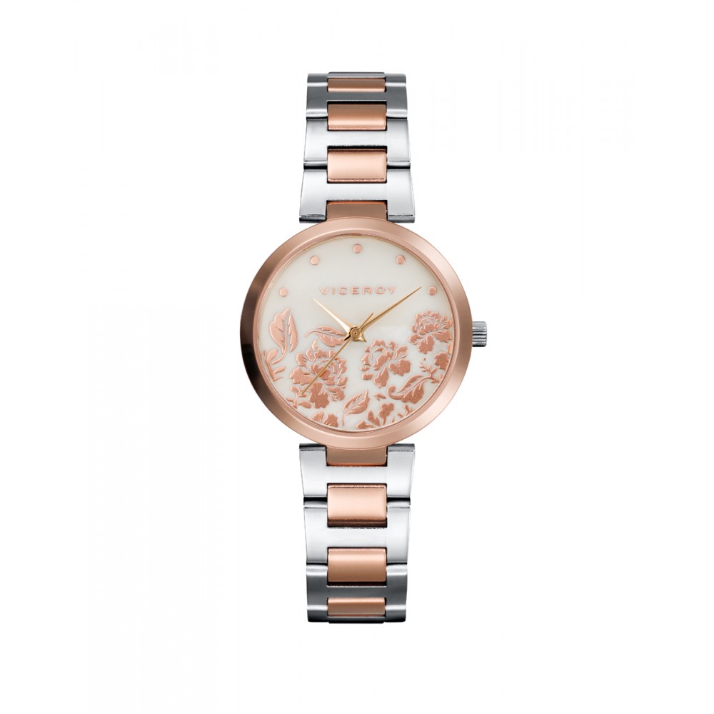 Embellece tu muñeca con Este reloj de mujer Viceroy de tres agujas, una joya que combina elegancia y feminidad. La caja y el brazalete de acero con IP rosa proporcionan un toque de sofisticación, mientras que la esfera de madre perla blanca, adornada con delicadas flores rosadas, añade un encanto sutil y romántico. Los índices en color rosa complementan el diseño, creando una armonía perfecta y una fácil lectura. Este reloj, con su estética refinada y su construcción de alta calidad, es el accesorio ideal para cualquier ocasión.