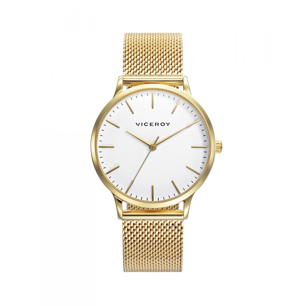 Elegante reloj de mujer Viceroy Kiss. Destaca por su elegante diseño de tres agujas, con una caja y malla milanesa de acero con IP dorado. Su esfera blanca, adornada con índices dorados, añade un toque de sofisticación y claridad. Ideal para la mujer que busca un accesorio refinado y moderno.