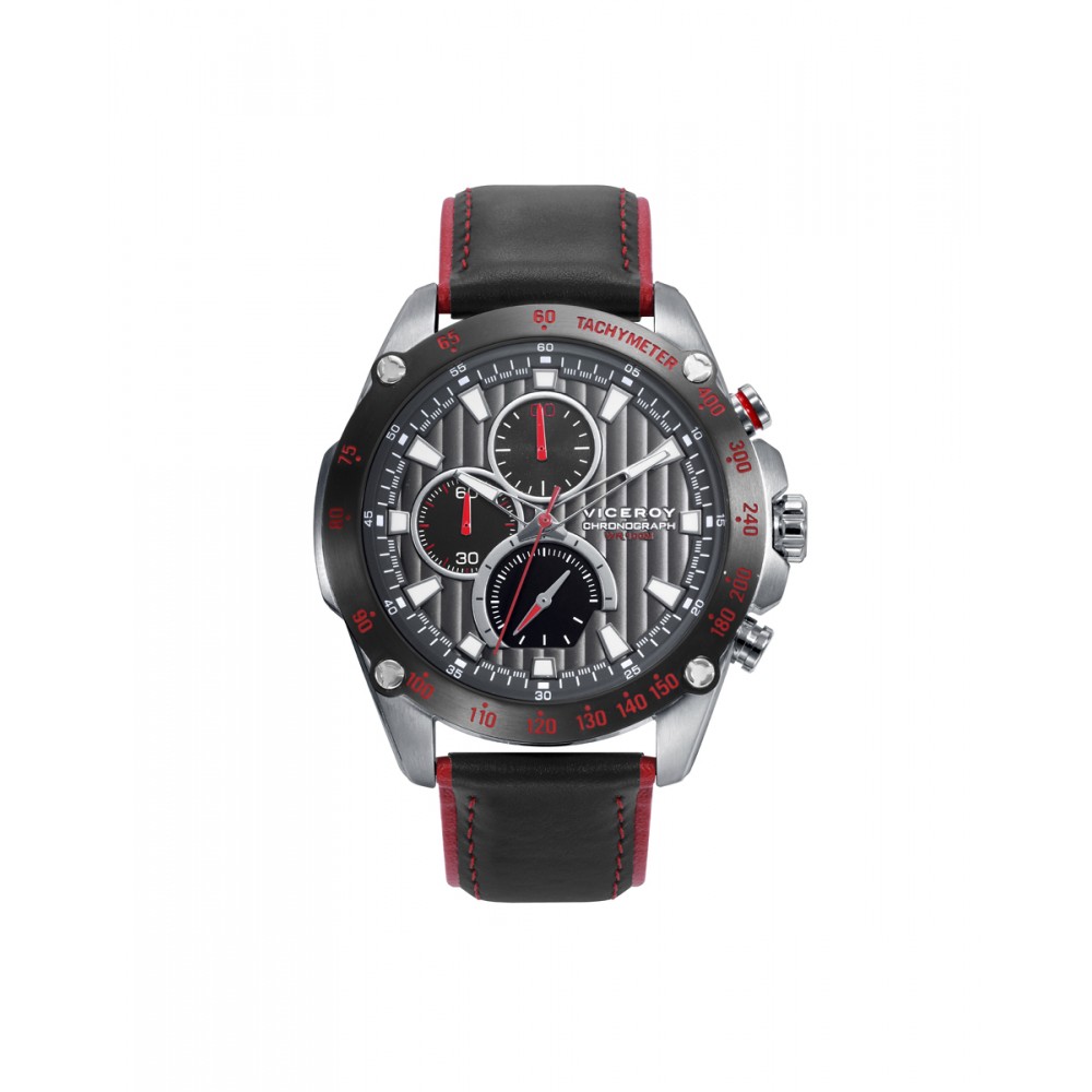 Formidable reloj de hombre Viceroy Magnum cronógrafo destaca por su robusto diseño con caja de acero y bisel negro. Su esfera gris, adornada con agujas indicadoras en color rojo, añade un toque de dinamismo. La correa negra con motivos rojos completa el conjunto, ofreciendo un contraste elegante y moderno. Ideal para el hombre que busca un reloj funcional y estilizado con una apariencia deportiva y sofisticada.