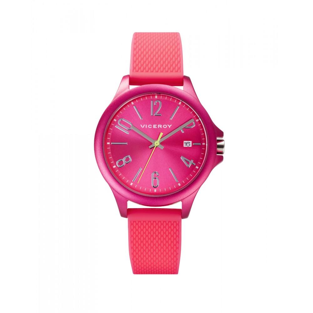 Atrevido reloj de mujer Viceroy Colours, es un accesorio vibrante con su caja de aluminio fucsia y correa de silicona a juego. Su esfera fucsia cuenta con índices en plateado y un calendario ubicado a las 3 en punto, destacando además un segundero amarillo que añade un toque llamativo y moderno a este diseño audaz y funcional.