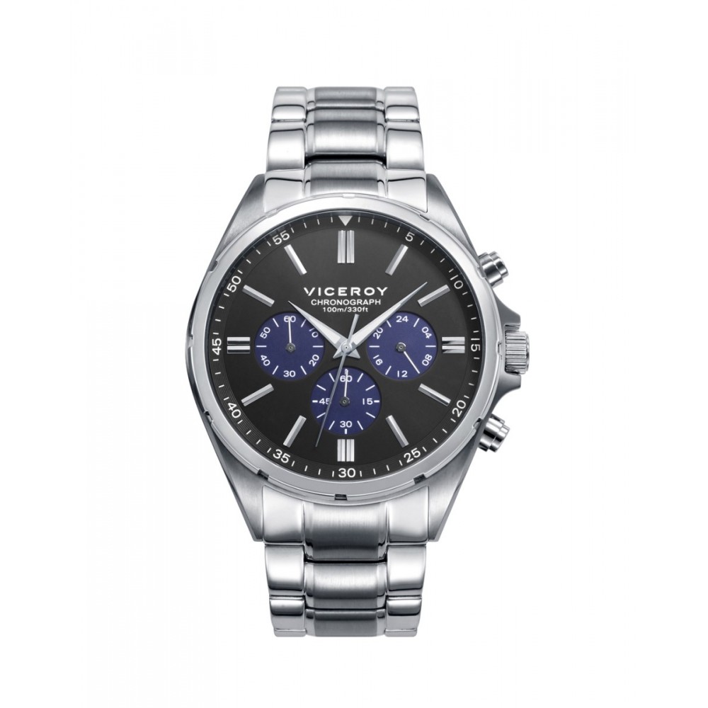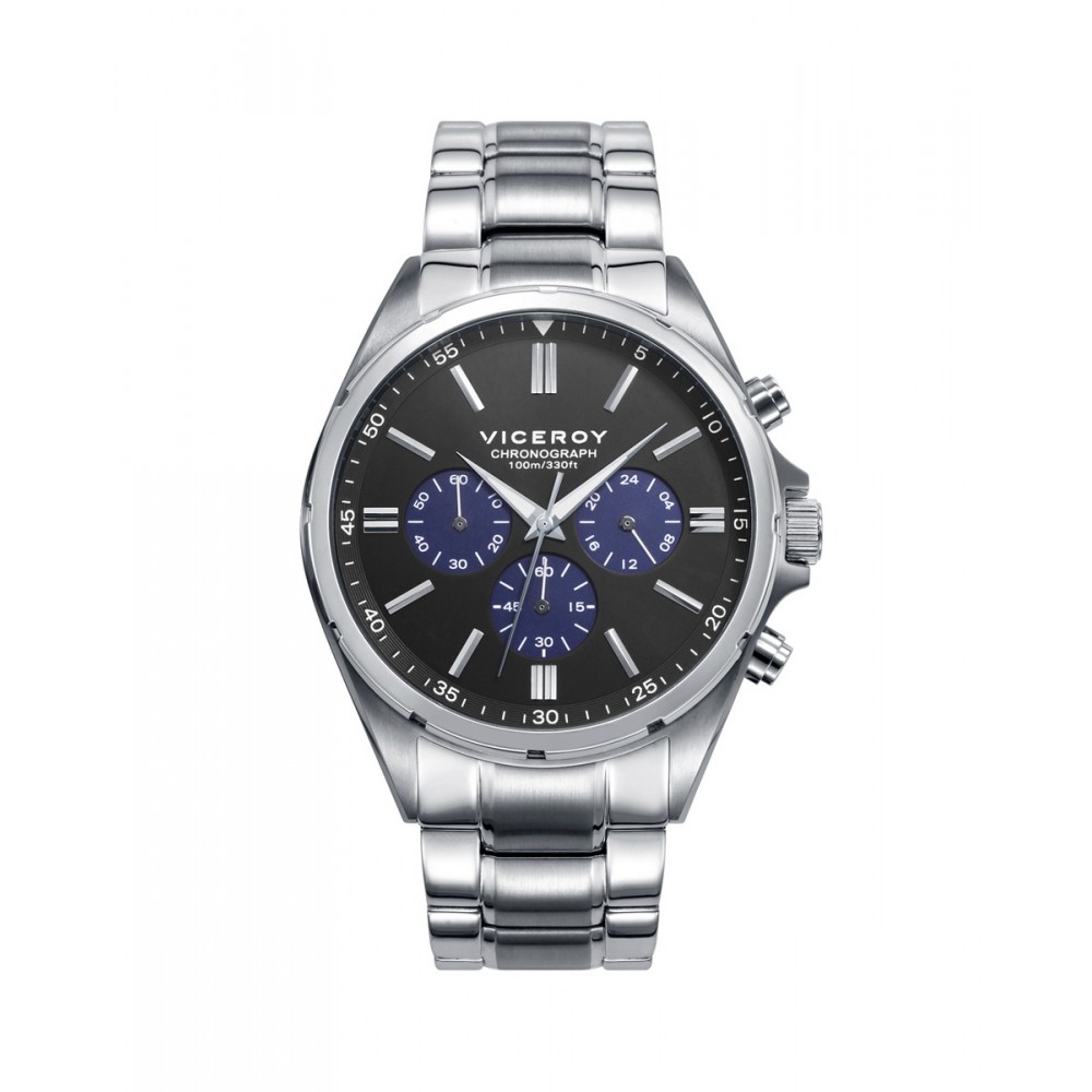 Reloj de Hombre Viceroy Magnum, cronógrafo con caja y brazalete en acero, esfera en negro con indicadorees azules y agujas en color blanco.