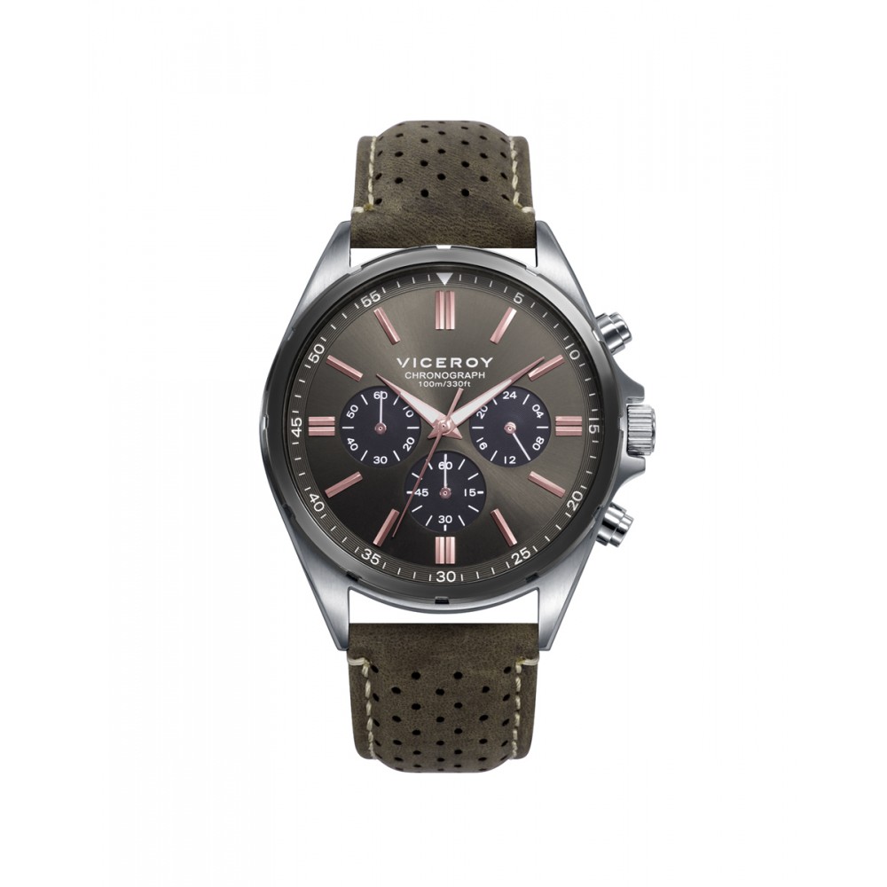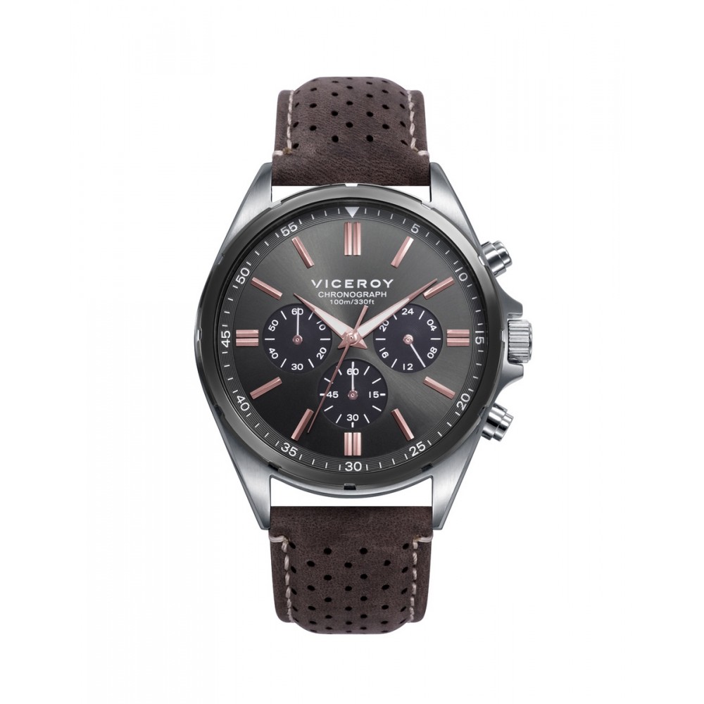 Firme reloj de hombre Viceroy Magnum cronógrafo presenta un diseño robusto y elegante con su caja de acero y correa de piel marrón. Su esfera gris resalta con índices y agujas en tono rosado, mientras que las agujas indicadoras están en blanco, ofreciendo un contraste distintivo y funcional. Este reloj es ideal para quienes aprecian la precisión y el estilo refinado en sus accesorios diarios.