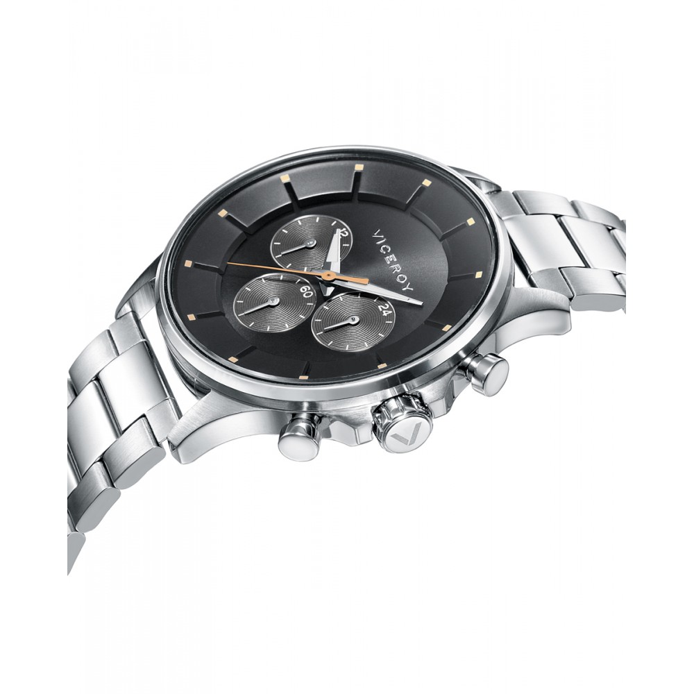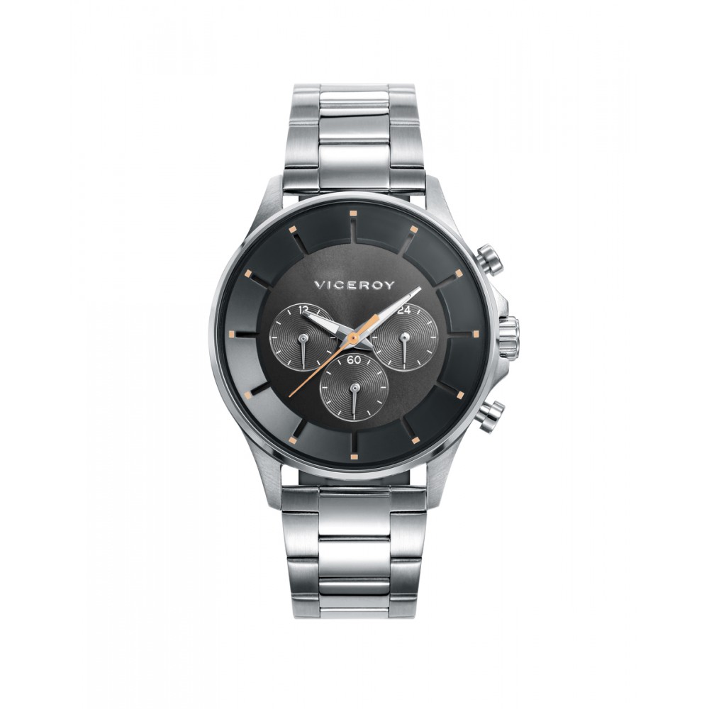 Este reloj de hombre con multifunción es una expresión de estilo y funcionalidad. Con una caja y brazalete de acero, este reloj garantiza durabilidad y una apariencia robusta. Su esfera negra, combinada con contadores grises a las 3, 6 y 9, ofrece una lectura clara y sofisticada. El toque vibrante del segundero naranja añade un elemento de dinamismo, haciendo que el accesorio destaque aún más.