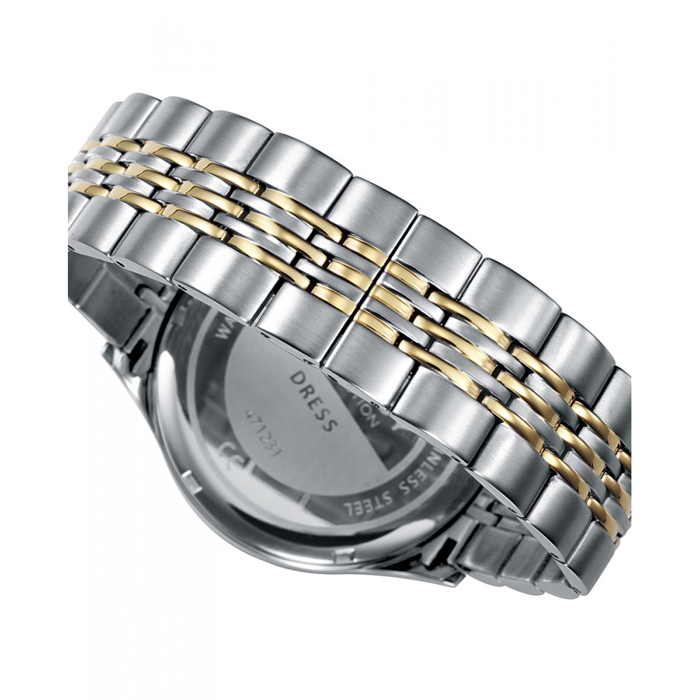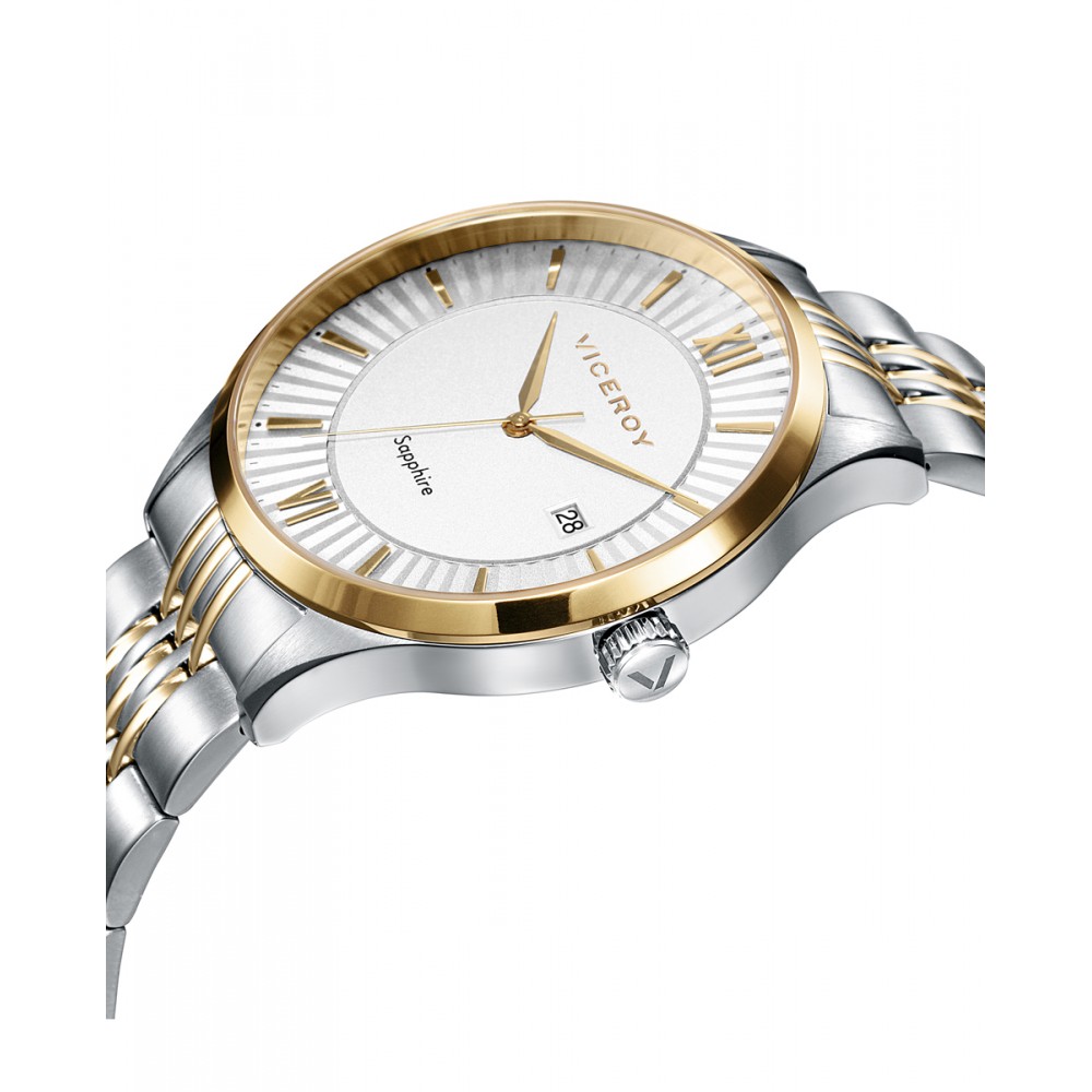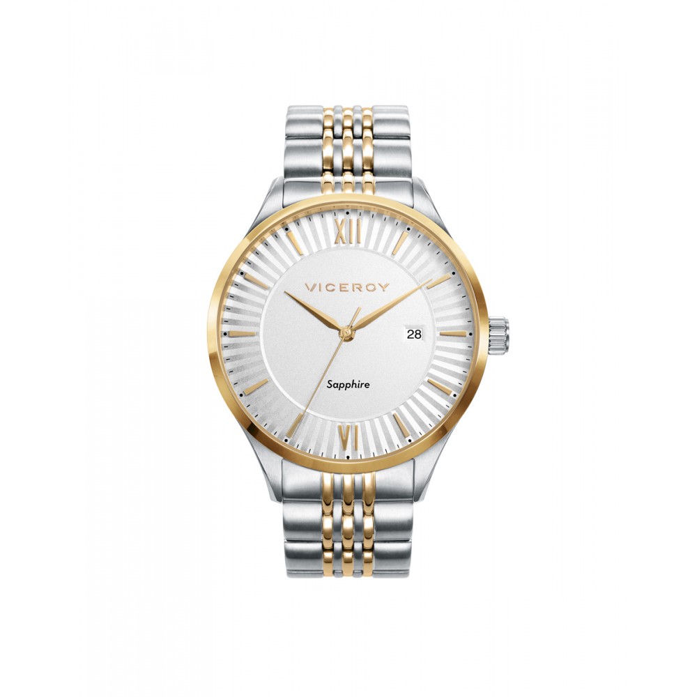 Elegante reloj de hombre Viceroy Dress, ofrece un estilo refinado y funcional con su caja y brazalete de acero bicolor en tono dorado. Su esfera plateada destaca con índices también en dorado, cuenta con un calendario situado a las 3 en punto y está protegido por un cristal de zafiro, asegurando durabilidad y sofisticación en cada detalle de este elegante accesorio.