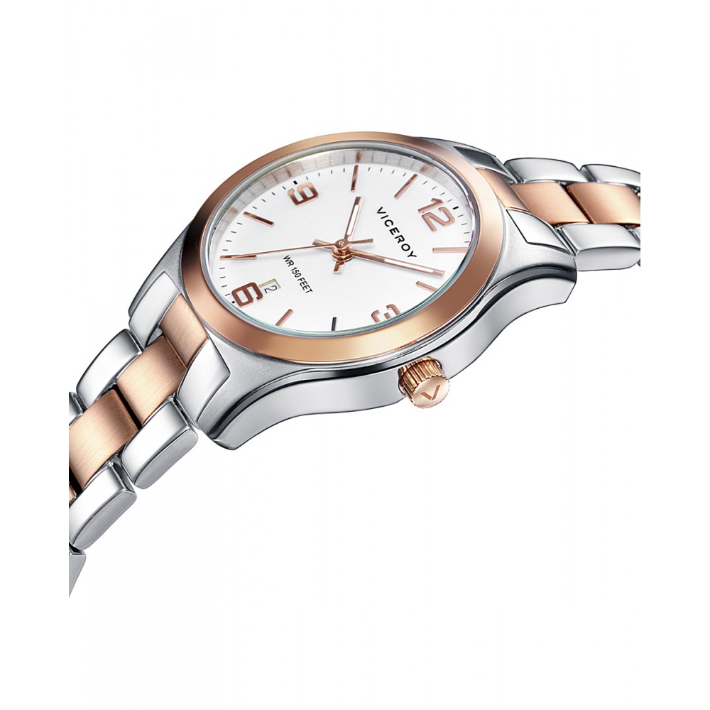 Un reloj de mujer Viceroy Grand combina elegancia y modernidad en una pieza impresionante. Con una caja y brazalete de acero con acabado IP rosa, ofrece un toque femenino y sofisticado. La esfera blanca crea un fondo limpio y clásico, mientras que los índices rosados y los números arábigos añaden un detalle sutil y elegante. Un calendario situado a las 6 en punto proporciona una funcionalidad adicional sin comprometer el diseño. Este reloj de tres agujas es ideal para la mujer que aprecia tanto la estética como la practicidad, haciendo de él una elección perfecta para cualquier ocasión, desde eventos laborales hasta salidas informales.