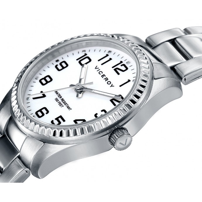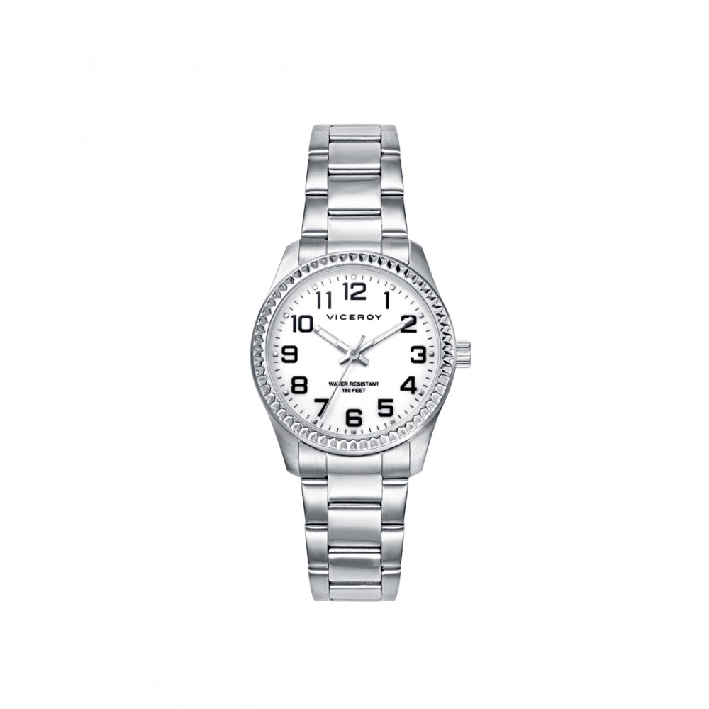 Este reloj de mujer Viceroy destaca por su elegante diseño y funcionalidad. Presenta una caja y brazalete de acero, que le otorgan durabilidad y un aspecto sofisticado. Su esfera blanca, limpia y clásica, está adornada con números árabes, facilitando una lectura clara y precisa. Las agujas en tono plateado complementan armoniosamente el diseño, añadiendo un toque de refinamiento. Este reloj es la elección perfecta para la mujer que busca un accesorio versátil y elegante, adecuado para cualquier ocasión.