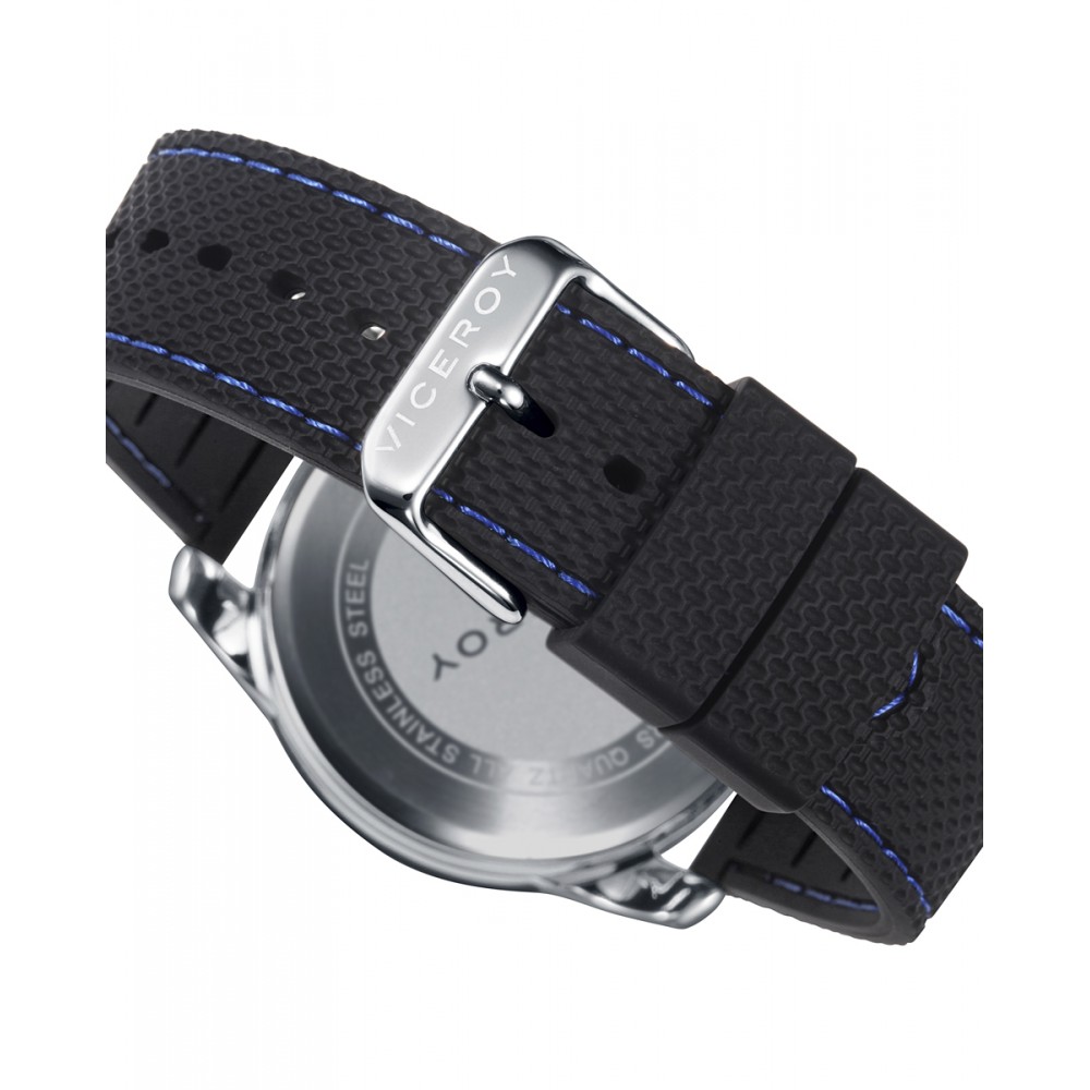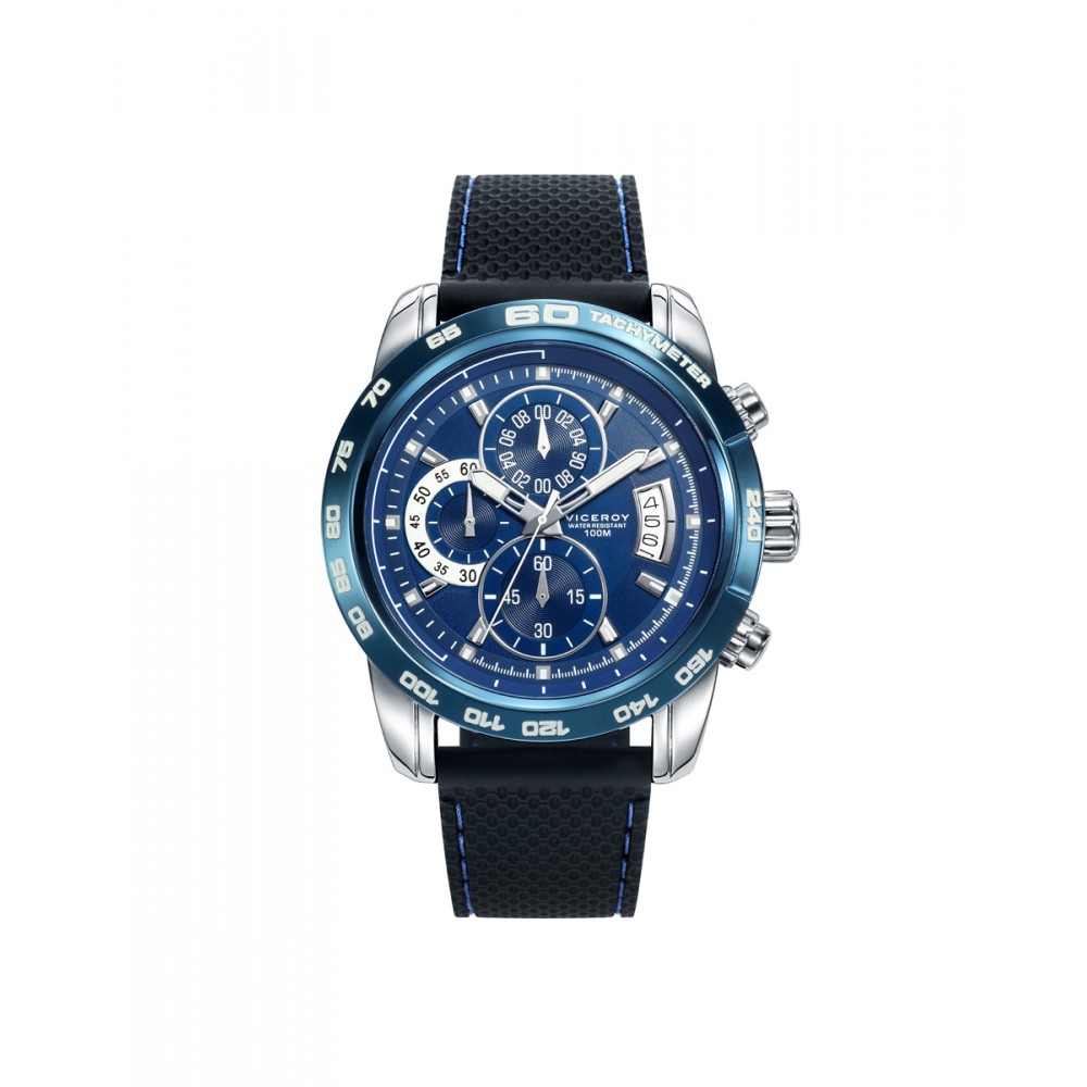Este reloj de hombre Viceroy Heat cronógrafo es una combinación excepcional de estilo y funcionalidad. Su caja de acero con bisel IP azul ofrece un toque de elegancia moderna. La esfera azul resaltada con índices blancos no solo es llamativa, sino también fácil de leer. Con contadores posicionados a las 6, 9 y 12, este reloj equilibra perfectamente su diseño. Además, su calendario ampliado a las 3 añade utilidad adicional. La correa de silicona negra con pespunte en azul completa este reloj, brindando comodidad y estilo sin igual.