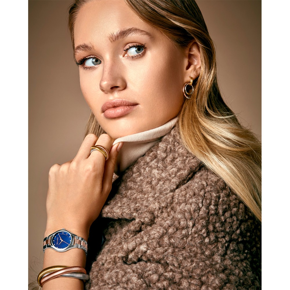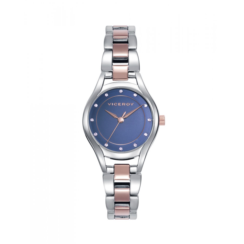 Un reloj diseñado para las que siempre buscan lo especial, lo original y lo exclusivo. Con su correa de acero bitono, la esfera en un azul elegante, las agujas rosas y las circonitas en el lugar de los índices, este reloj informal para mujer no dejará indiferente a nadie. El broche final para tus looks más auténticos, solo en Viceroy.