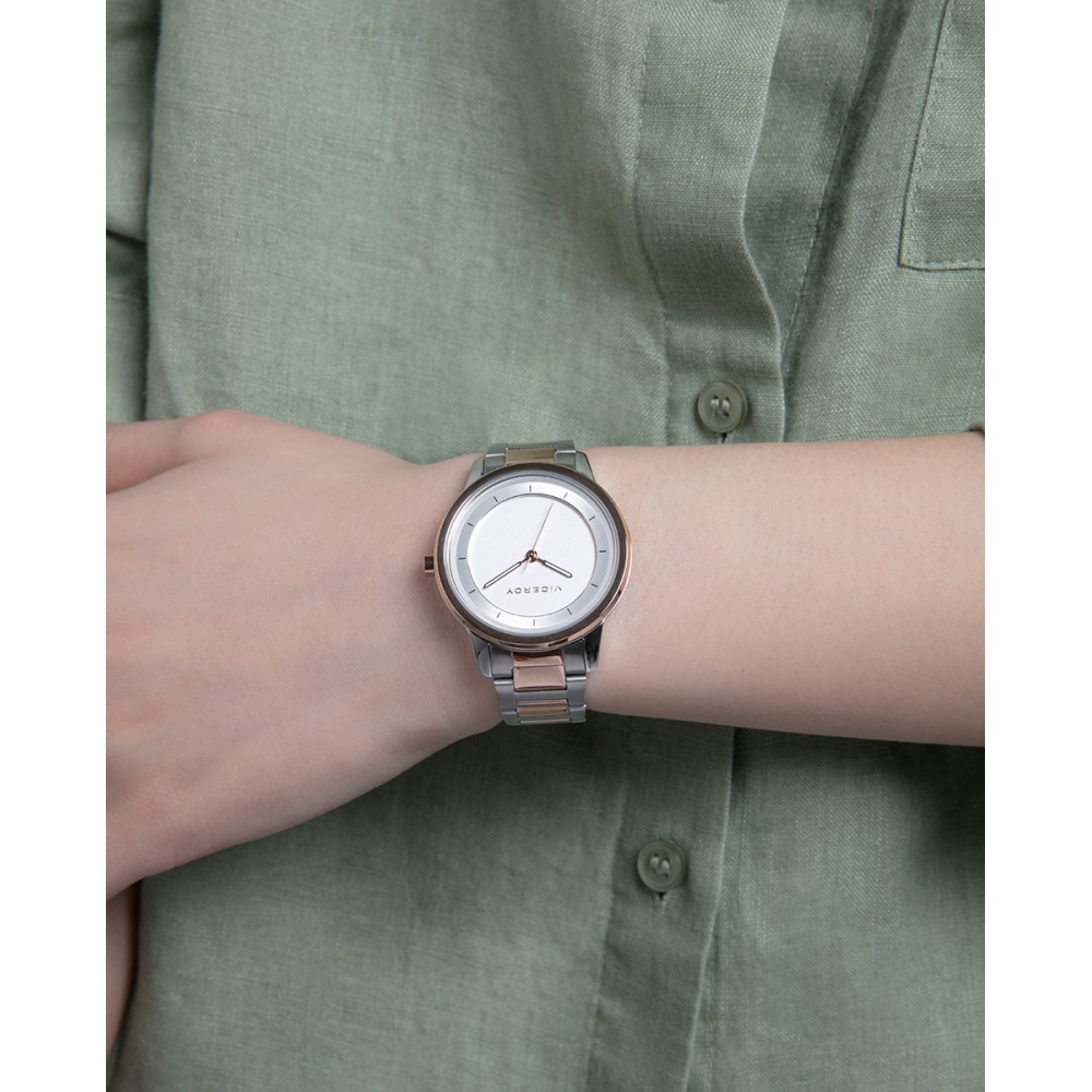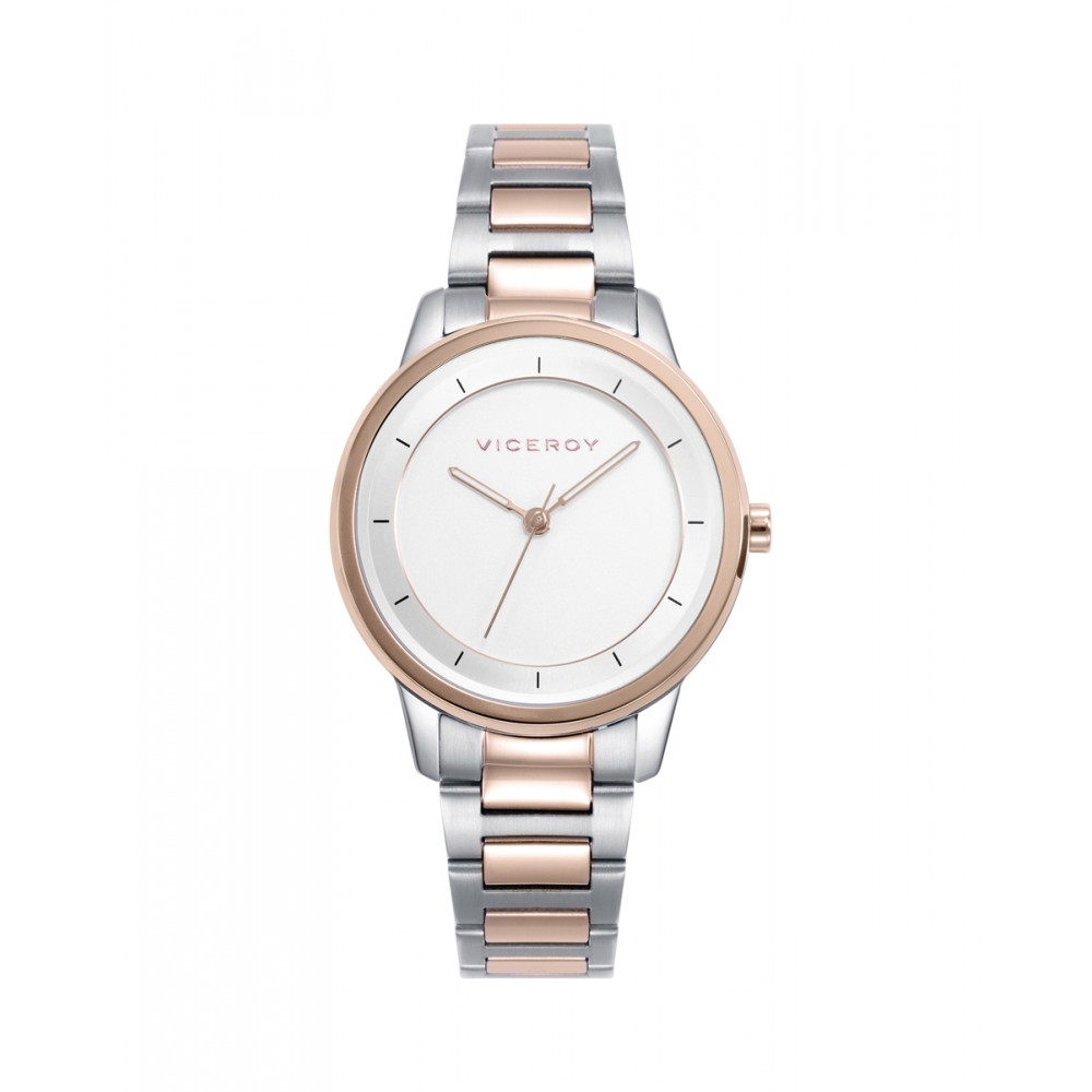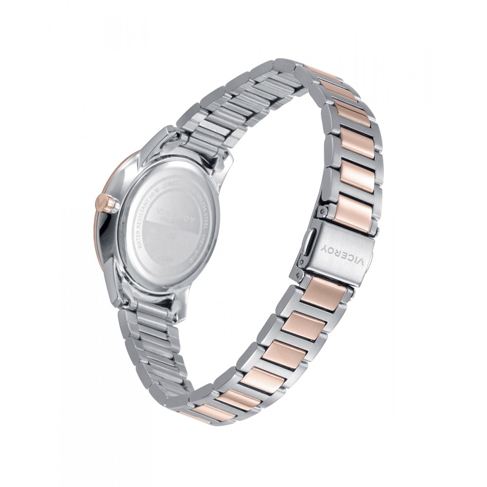 Reloj para mujer de tres agujas. Su caja de acero es solo el principio. Remata su sofisticación el bisel rosa, brazalete bicolor y una elegantísima esfera plateada con índices y agujas en rosa. Una joya, un complemento distintivo, el reloj que mereces.