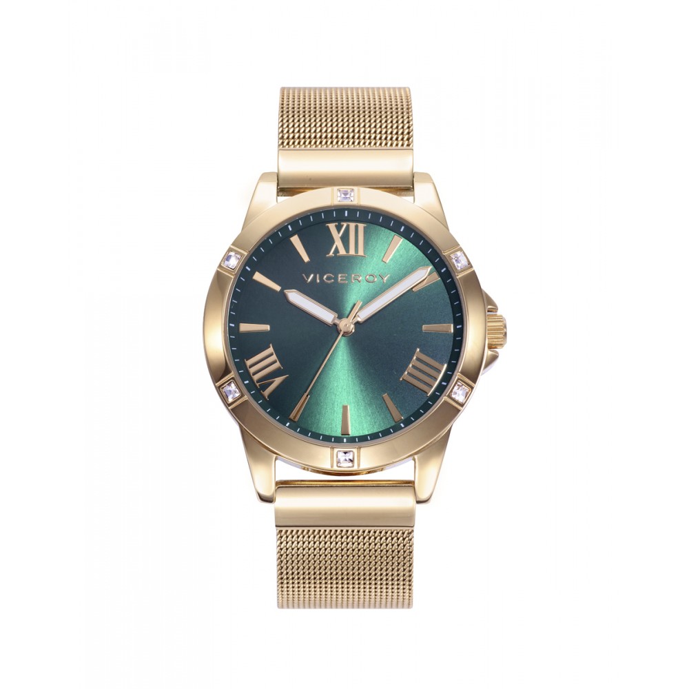 Descubre la elegancia incomparable dEste reloj de mujer Viceroy Chic tres agujas. Su caja y malla milanesa en acero con acabado IP dorado exudan refinamiento, mientras que el bisel engastado con baguettes añade un toque de lujo. La esfera verde, acentuada por agujas en dorado, fusiona la frescura con la sofisticación. Con un diseño meticuloso y detalles exquisitos, este reloj es el complemento ideal para realzar tu estilo en cualquier ocasión, ofreciendo una combinación perfecta de elegancia y distinción.