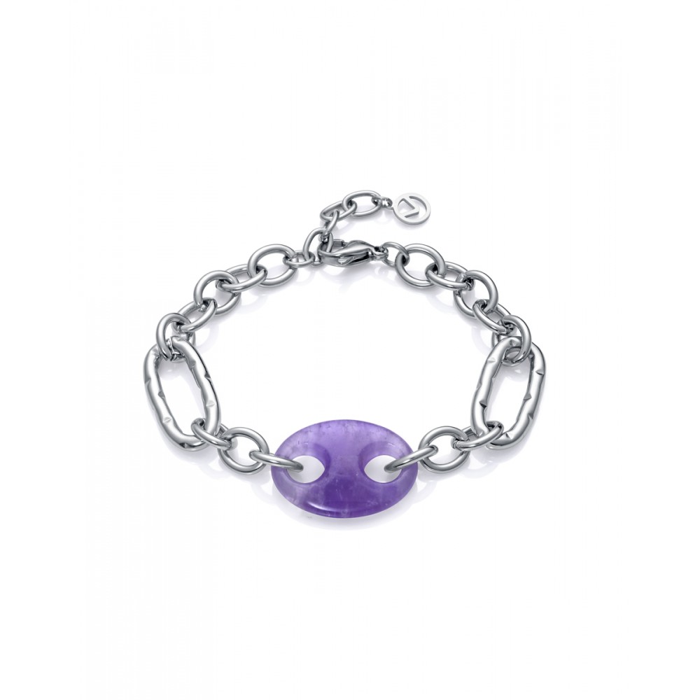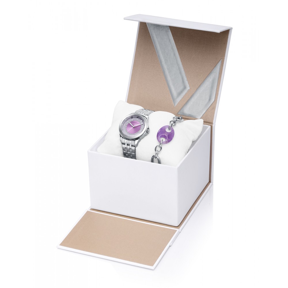 Un pack para ella compuesto por un reloj de acero con esfera gris y subesfera rosa rodeada de circonitas, y una pulsera con motivo hecho de amatista natural. Una apuesta segura para conseguir un look sofisticado, a la última y femenino. Longitud de la pulsera: 17,5 cm.