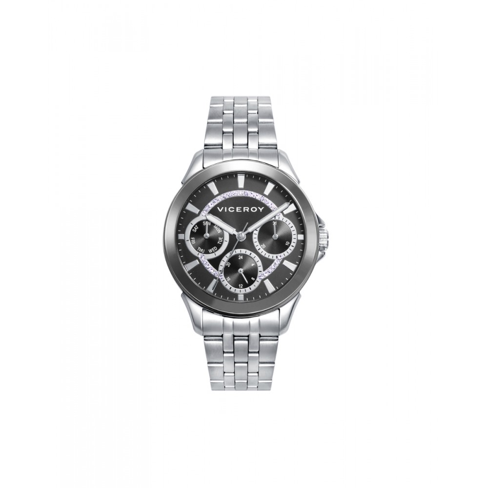 Reloj con multifunción para mujer, con brazalete y caja de acero, esfera negra y contadores a las 3, 6 y 9. La unión de colores opuestos siempre resulta atractiva, y eso, unido a un diseño sofisticado, es sinónimo de un reloj imprescindible. Acabas de encontrar el complemento que tanto necesitabas, solo en Viceroy.
