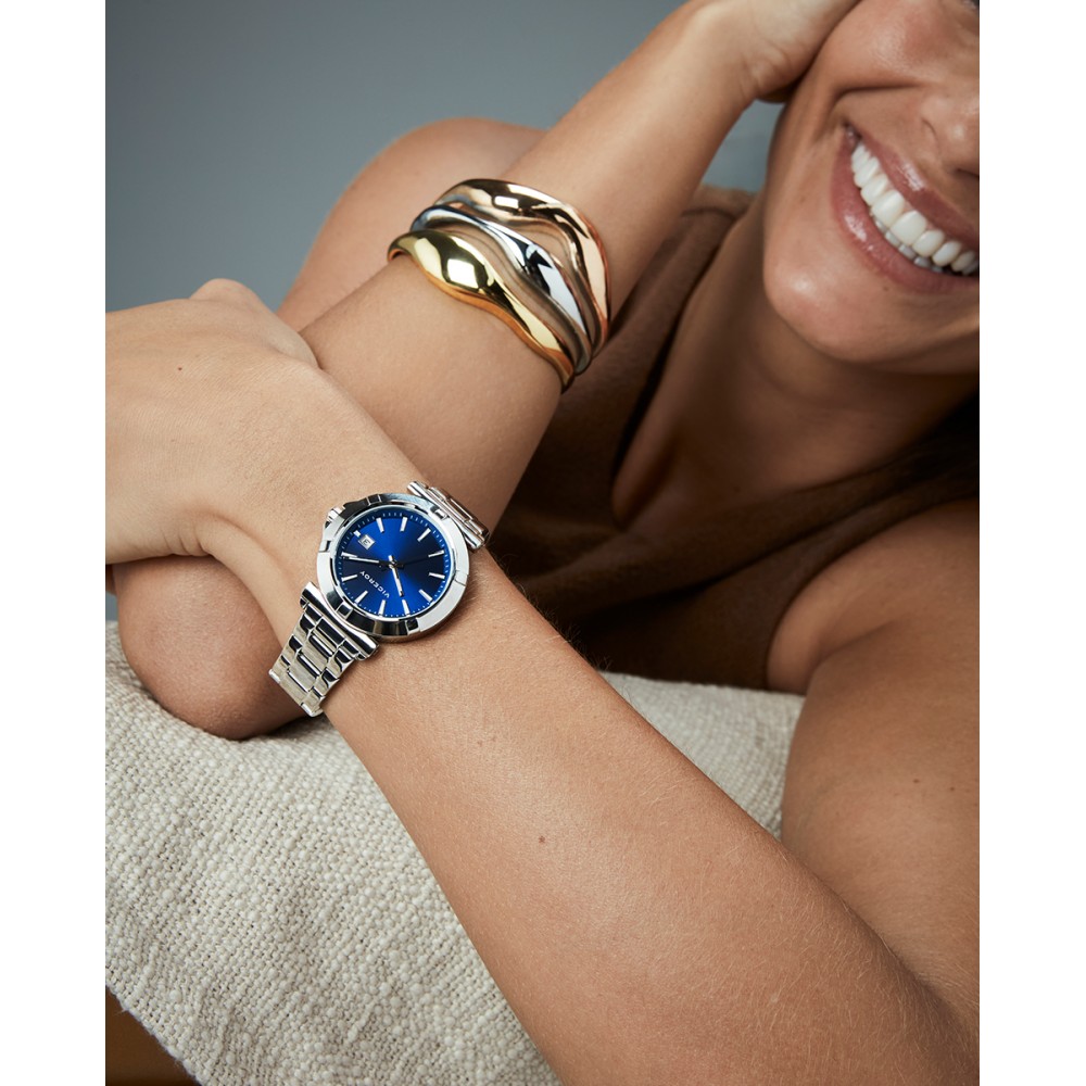 Reloj elegante de mujer con tres agujas y calendario integrado, diseñado con caja de acero resistente 5 ATM y brazalete a juego. La esfera azul combina índices visibles y agujas plateadas, mientras el cristal mineral protege la pieza, ofreciendo durabilidad y un estilo sofisticado que se adapta tanto a looks diarios como a ocasiones especiales.