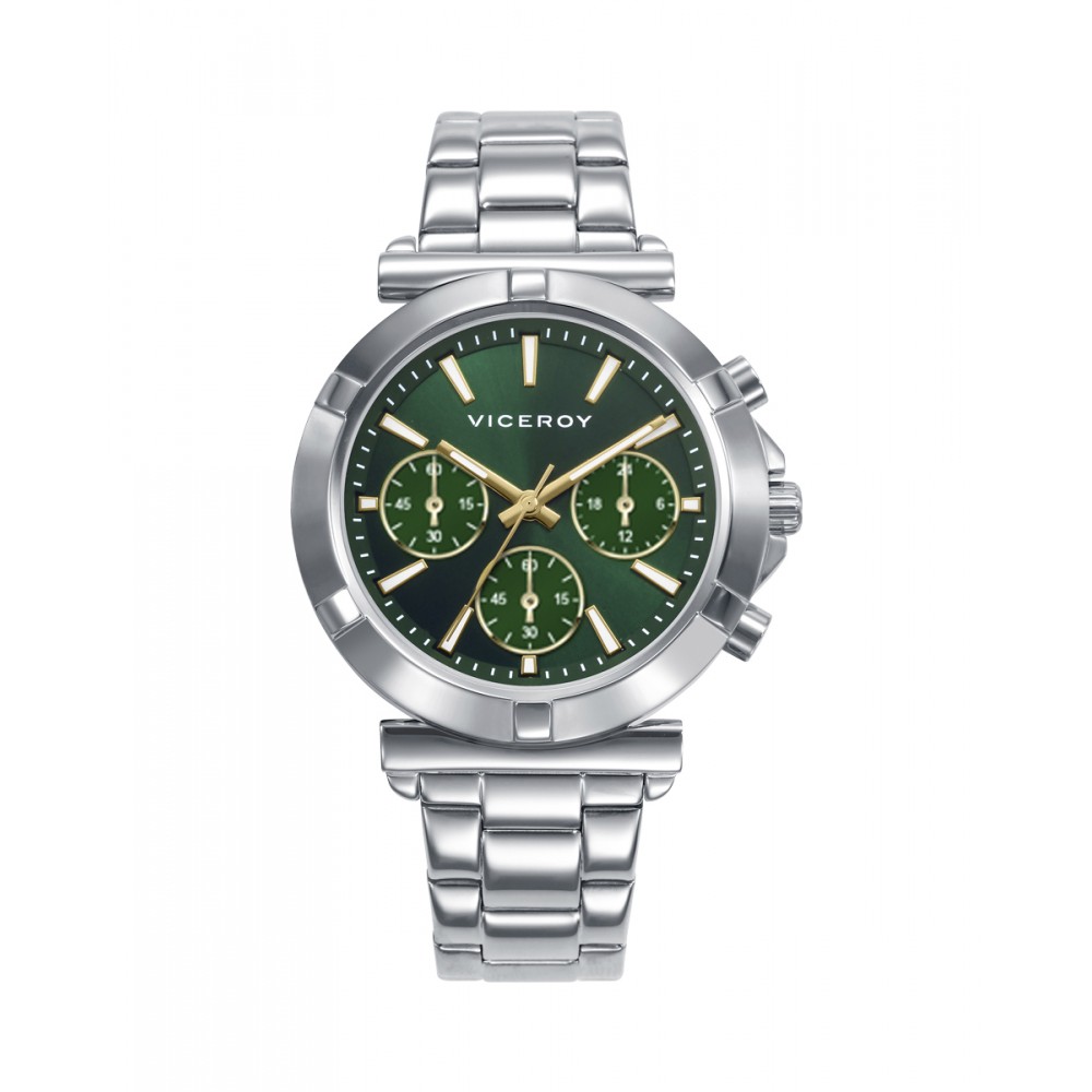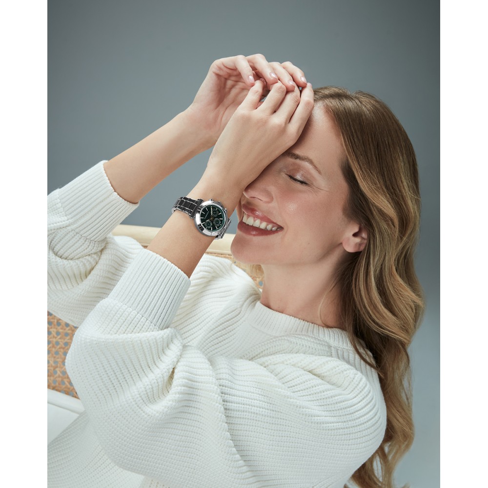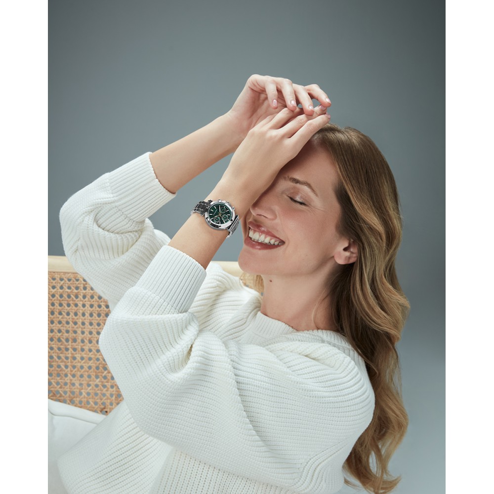 Modelo femenino con cronógrafo y caja de acero resistente a 5 ATM, pensado para combinar funcionalidad y estilo. Su brazalete de acero aporta solidez y sofisticación, mientras la esfera verde destaca con índices elegantes. Las agujas horarias y contadoras en tono IP dorado, junto al cristal mineral, completan un diseño moderno y refinado, ideal para cualquier ocasión.