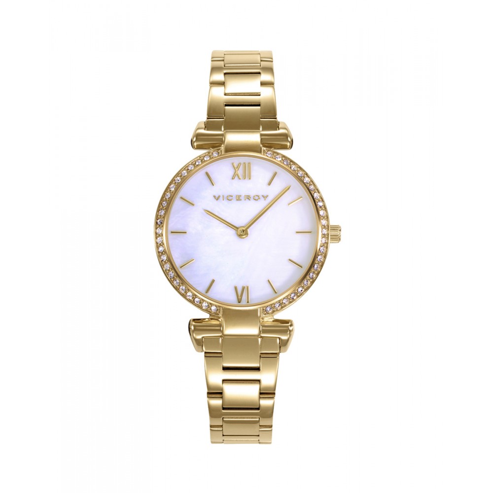 Este reloj de mujer de dos agujas destaca por su diseño elegante y sofisticado. La caja de acero con IP dorado y el bisel adornado con circonitas blancas aportan un toque de lujo. El brazalete de acero IP dorado complementa la esfera de madreperla, mientras que los índices y las agujas doradas añaden un toque de armonía y estilo. El cristal mineral asegura durabilidad, haciendo de este reloj una pieza ideal para quienes buscan una combinación de belleza y funcionalidad en su día a día.