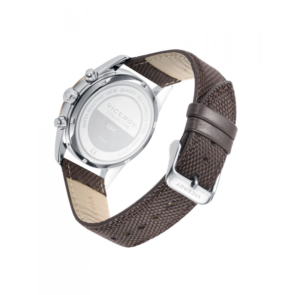 Reloj de hombre Viceroy multifunción presenta un diseño robusto y moderno, con una caja de acero bicolor con detalles en IP rosa. Su correa negra de nylon ofrece comodidad y durabilidad, mientras que la esfera negra con indicadores rosa añade un toque distintivo y elegante. Para hombre que quiere estilo en su muñeca.