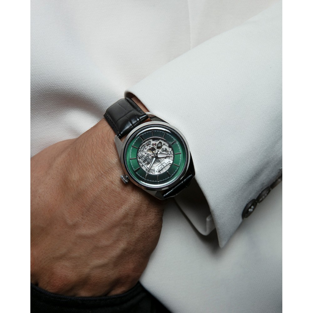 Este reloj de hombre automático combina elegancia y tecnología en un diseño impresionante. La caja de acero y el cristal de zafiro garantizan durabilidad y resistencia, mientras que la correa de piel negra añade un toque clásico y sofisticado. La esfera verde transparente, que permite ver el movimiento interno del reloj, aporta un elemento técnico único y atractivo. Los índices y las agujas horarias en color plata crean un contraste elegante, completando el estilo refinado de este reloj. Ideal para el hombre que valora tanto la estética como la funcionalidad avanzada en un accesorio de calidad.