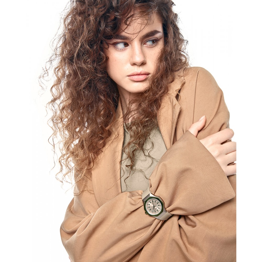 Un sofisticado reloj de mujer de tres agujas combina estilo y funcionalidad. La caja de aluminio en tono beige se complementa con un bisel de acero en color verde, creando un contraste elegante y moderno, mientras la correa de silicona beige proporciona comodidad y resistencia. Un accesorio perfecto para cualquier ocasión y único de Viceroy.