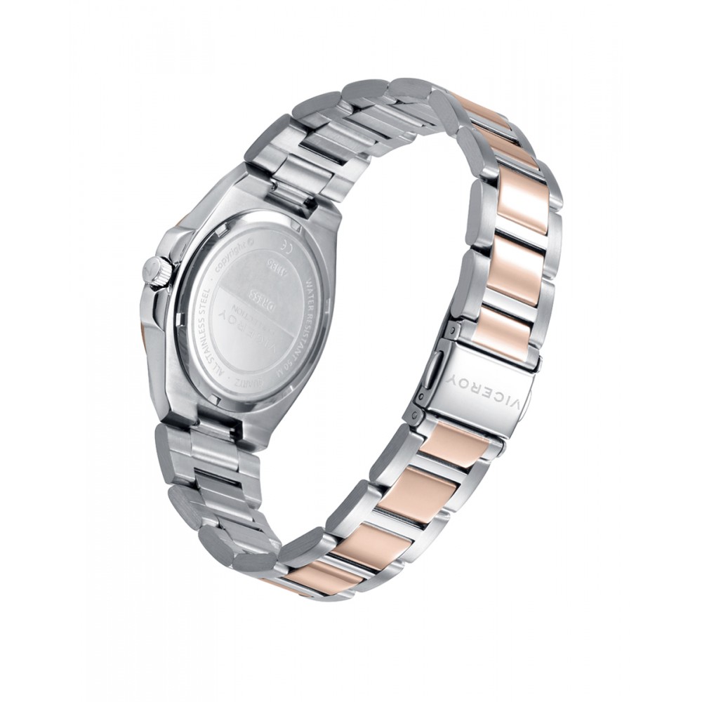 Modelo para mujer de tres agujas con caja y brazalete en acero bicolor. Su esfera rosa sellada con sus índices y agujas rosados confirman el esplendor de un reloj hermoso, un complemento refinado creado para destacar. Firma con él tus mejores looks y vence en cualquier conquista. Solo en Viceroy.