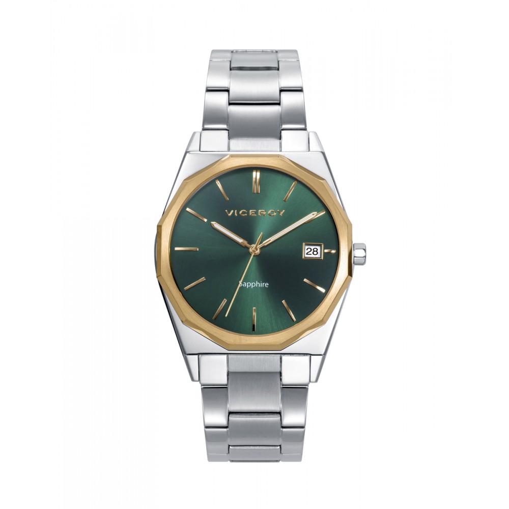 Reloj para hombre extraplano con cristal zafiro, caja y brazalete de acero, bisel dorado y esfera verde con el logo de Viceroy grabado en dorado. Las agujas de las horas y de los minutos cuentan con efecto "luminous". Una auténtica joya de Viceroy en busca de dueño.