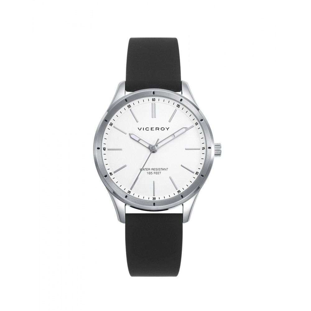 Modelo de reloj para mujer de acero y tres agujas. Su elegante correa de silicona negra es solo el principio. Remata su sofisticación la esfera blanca con índices y agujas plateados. Una joya, un complemento distintivo, el reloj que mereces.