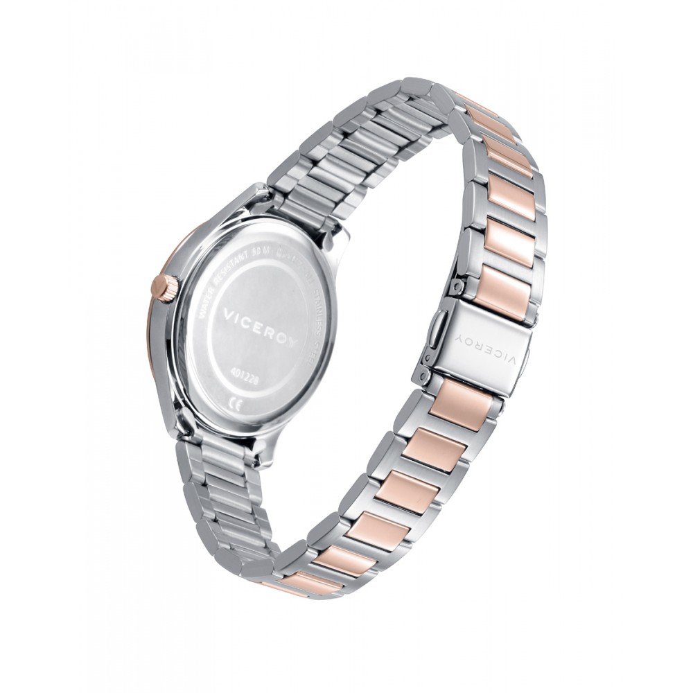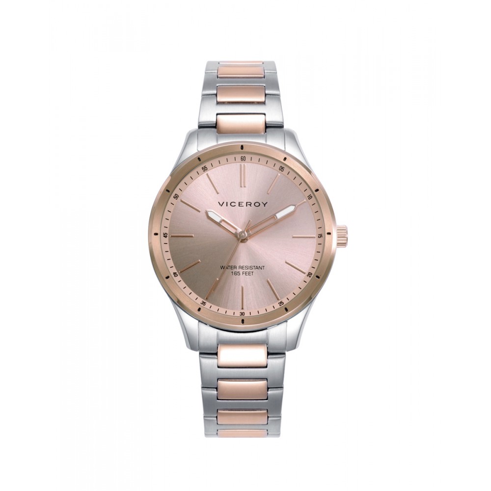 Modelo de reloj para mujer de acero y tres agujas. Su caja de acero es solo el principio. Remata su sofisticación el bisel y esfera rosados con índices y agujas dorados. Una joya, un complemento distintivo, el reloj que mereces.