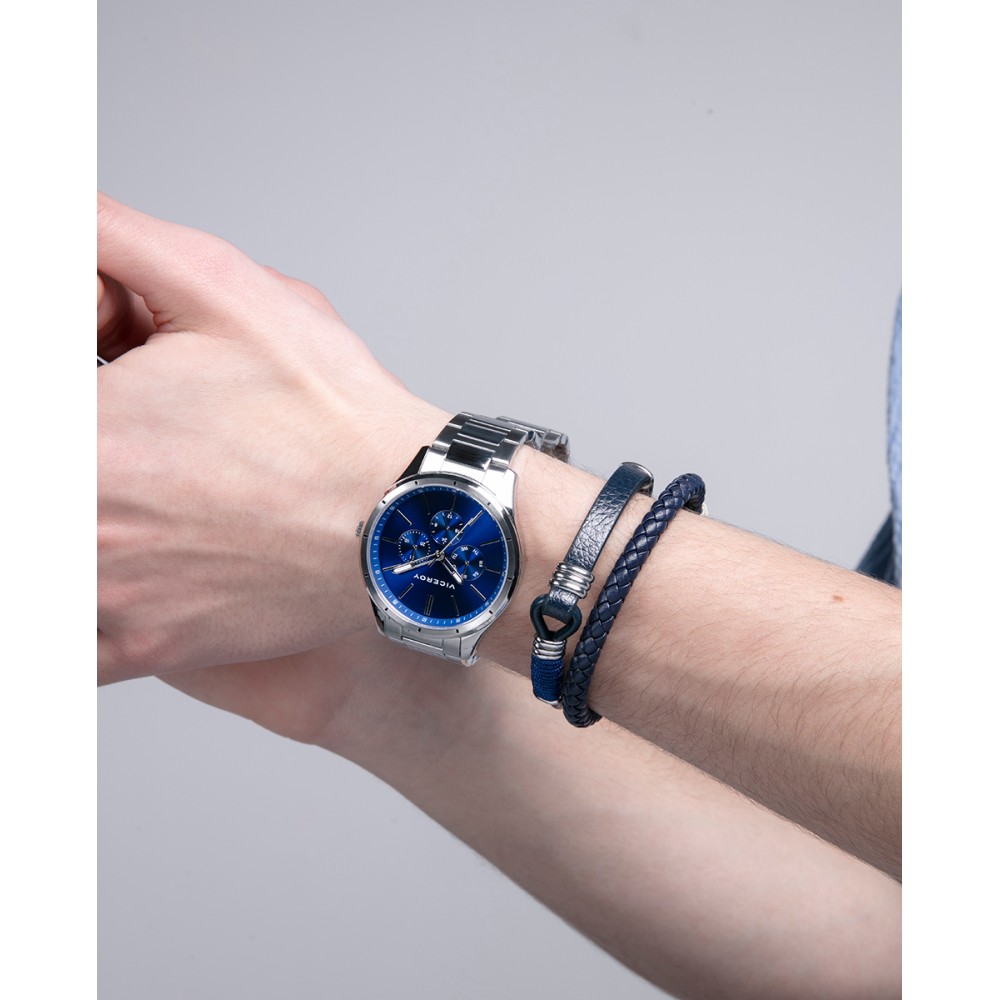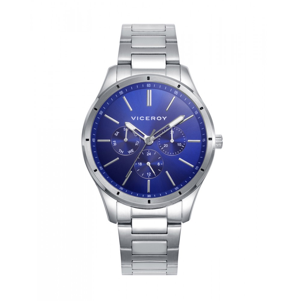 Reloj multifunción de hombre con caja y brazalete de acero. Su esfera azul va acompañada por unos índices y agujas en plata, sumándole atractivo a lo preciso. Maneja tu tiempo de la mejor manera, con este modelo exclusivo de Viceroy.