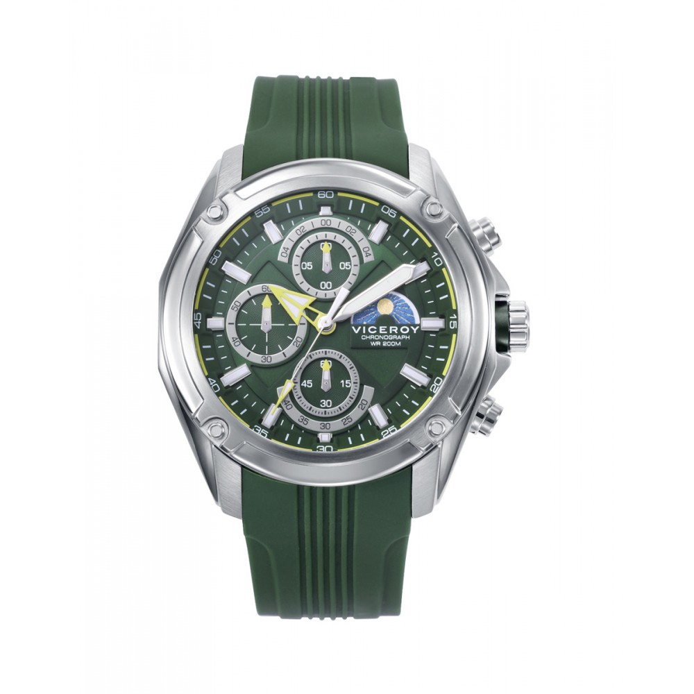 Un reloj robusto y dinámico: este cronógrafo de hombre con caja de acero, resistente al agua hasta 20 ATM, se presenta con una correa de silicona verde que ofrece comodidad y estilo. Su esfera verde, decorada con índices y agujas en tonos amarillo y plata, crea un contraste vibrante y moderno. Equipado con cristal mineral resistente, es la elección perfecta para quienes buscan un reloj funcional, deportivo y con un diseño audaz.