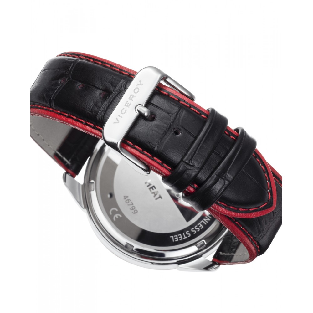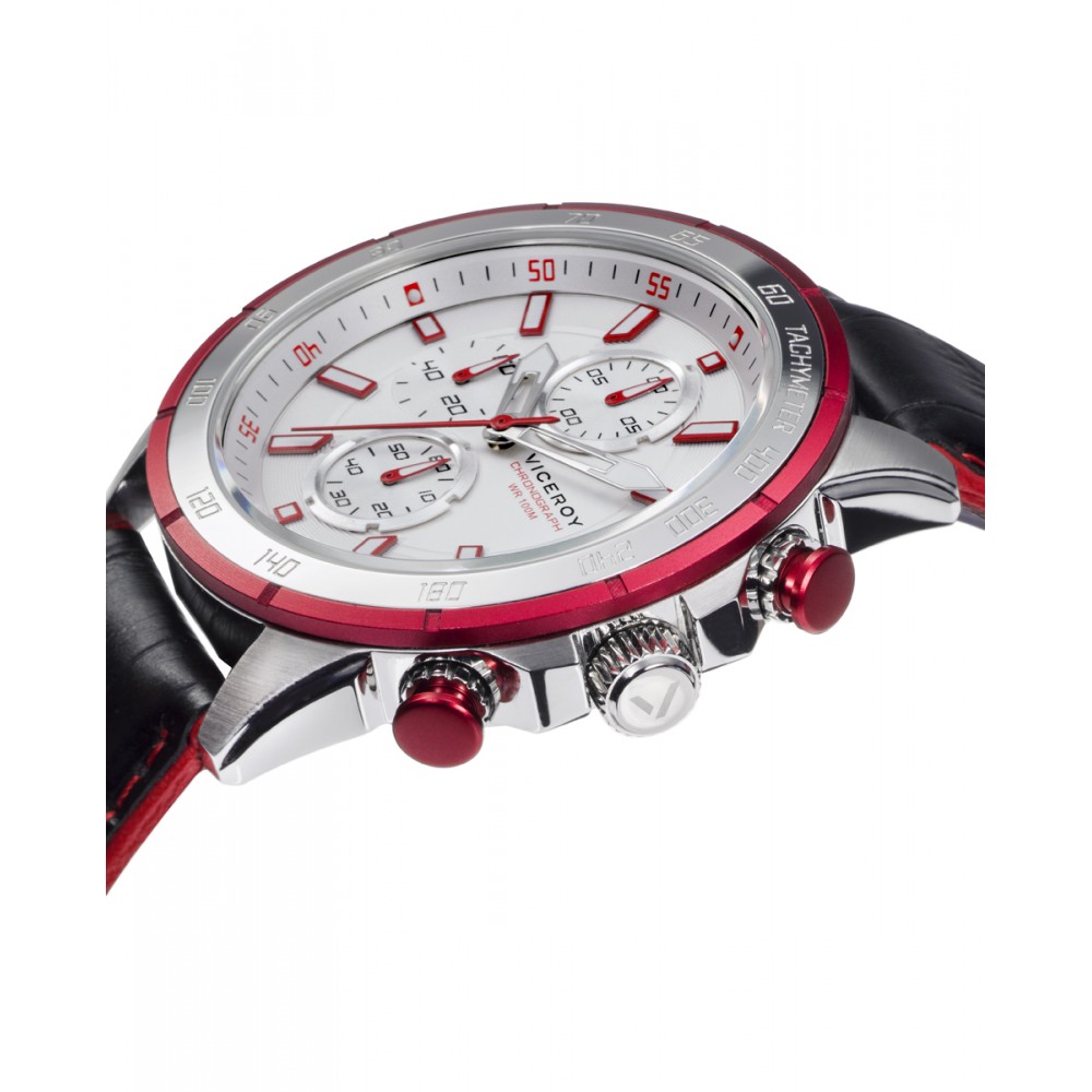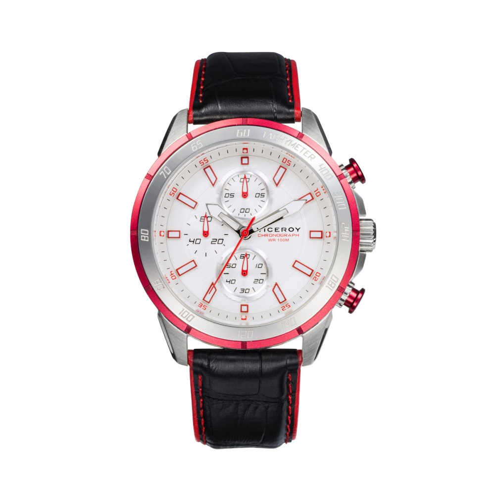 Potente reloj de hombre Viceroy Heat cronógrafo destaca por su robusto diseño con caja de acero y bisel de aluminio rojo. Su esfera plateada, complementada por contadores a las 6, 9 y 12, y un segundero rojo, añade un toque de sofisticación. La correa de piel negra con extremos en rojo completa este accesorio, ofreciendo un contraste elegante y moderno.