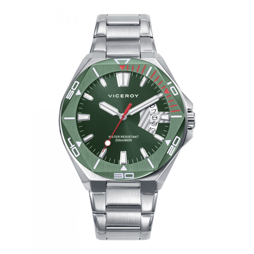 De diseño atrevido y moderno, este reloj masculino de tres agujas con calendario combina la robustez de su caja bitono de acero Ip verde con la elegancia de su brazalete de acero. La esfera verde con índices claros y la aguja de segundos en rojo aportan contraste y estilo, mientras las agujas en plata garantizan una lectura precisa. Su resistencia de 20 Atm y cristal mineral lo convierten en un compañero fiable para el día a día y aventuras deportivas.