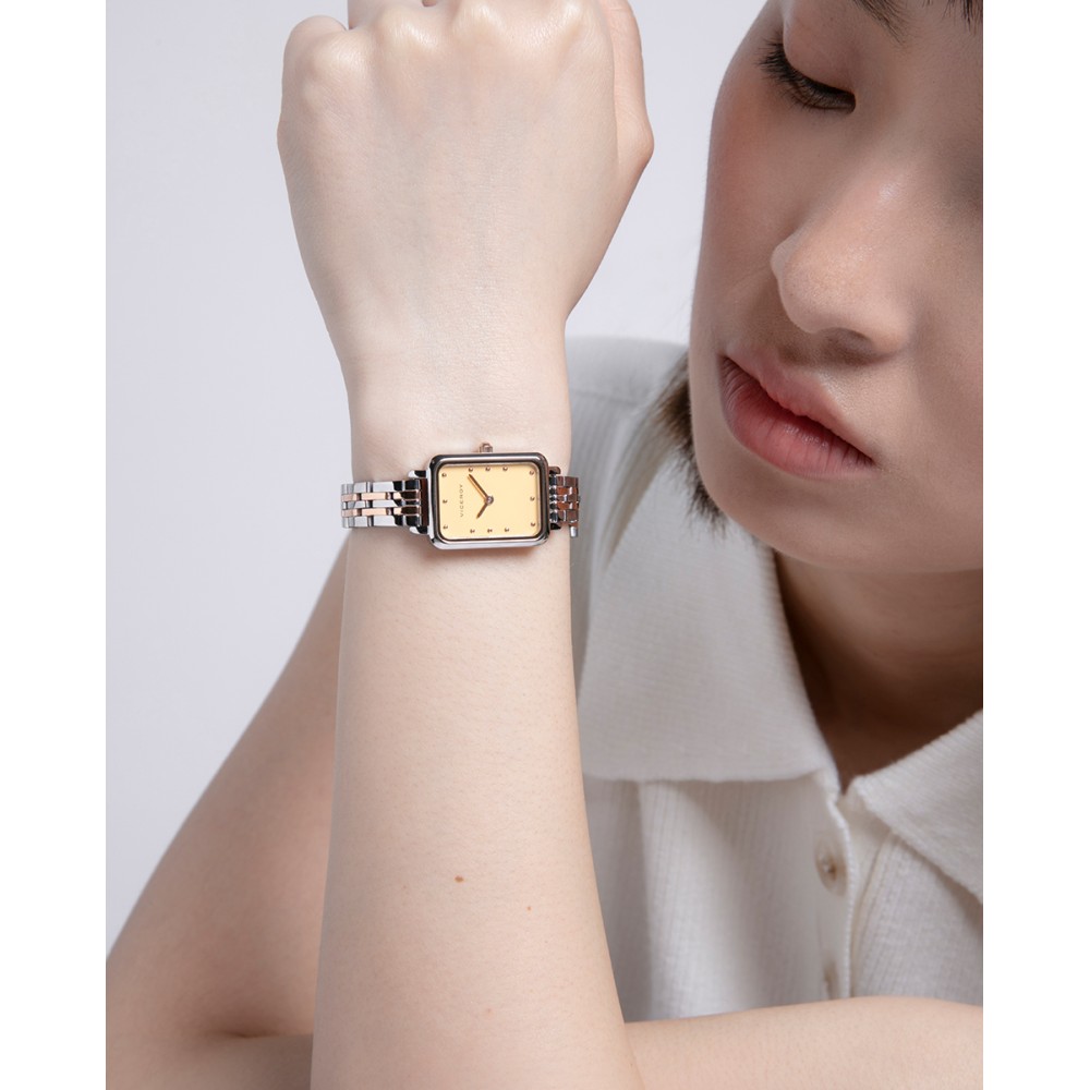 Un reloj de diseño femenino creado para triunfar en todos tus momentos. La caja de acero, realzada con un bisel y corona en rosa, le da un toque de calidez y sofisticación. Su esfera anaranjada se combina sutilmente con el conjunto, ofreciendo un contraste de lo más llamativo. Un complemento para medir y disfrutar al máximo del tiempo.