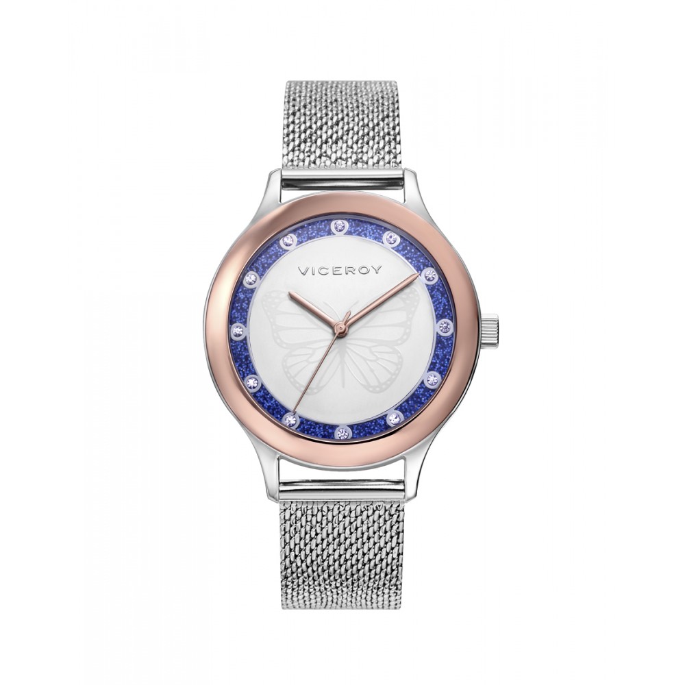 Este reloj de mujer Viceroy KISS presenta una elegante esfera blanca decorada con un dibujo de mariposa. Su bisel interior con glitter está adornado con circonitas, aportando un toque de brillo y sofisticación. El diseño se completa con una malla de efecto diamantado y un cierre deslizante, ofreciendo comodidad y estilo.