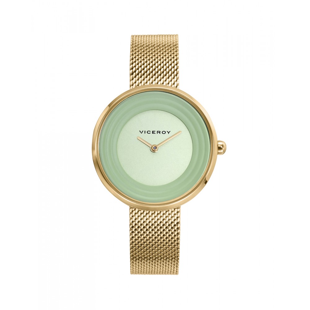 El minimalismo y la elegancia se combinan en este reloj de acero dorado para mujer de Viceroy. Una esfera verde sin segundero y una fina y femenina correa en malla milanesa forman este imprescindible para cualquier ocasión, de las casuales a las elegantes. Viceroy, más de 40 años a la vanguardia de la relojería y las joyas.