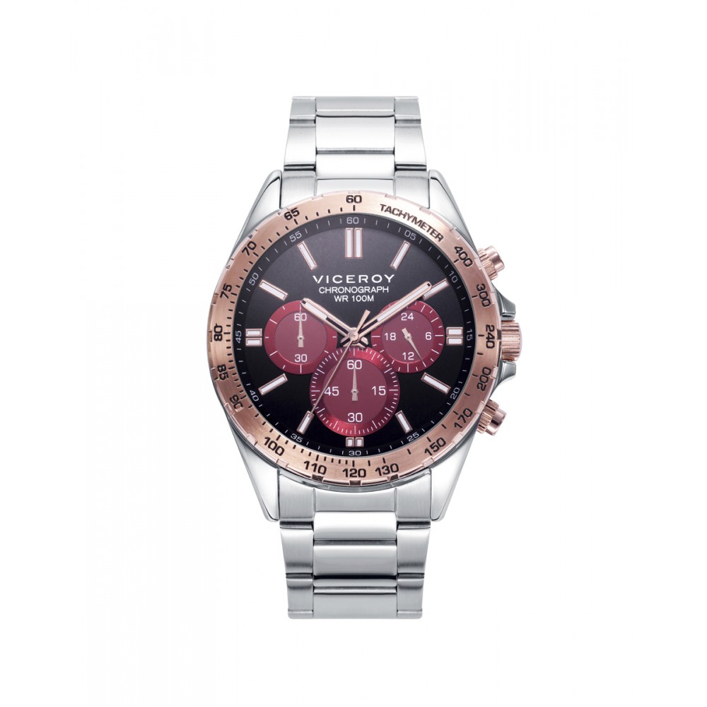 Este reloj de hombre Viceroy Magnum cronógrafo es una expresión de refinamiento y funcionalidad avanzada. Con su caja y brazalete de acero, ofrece durabilidad y estilo contemporáneo. El bisel rosado añade un toque de elegancia distinguida, mientras que la esfera negra con contadores en color burdeos agrega un contraste audaz y sofisticado. Este reloj es una opción perfecta para aquellos que aprecian la precisión y el diseño distintivo en un accesorio de alta calidad.