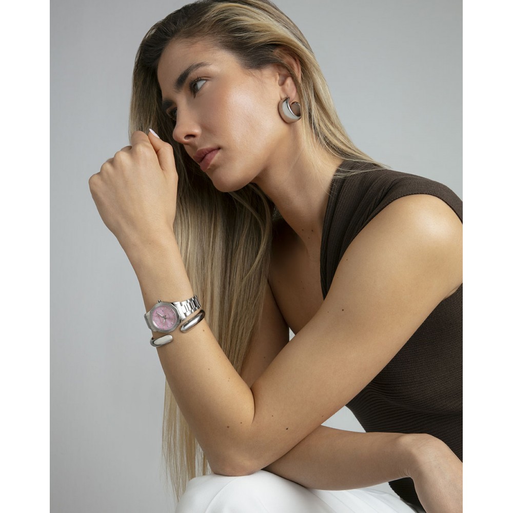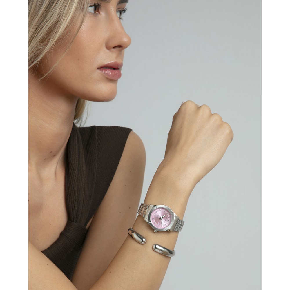 Un toque de delicadeza y resistencia: este reloj de mujer con tres agujas y calendario combina una robusta caja de acero con un brazalete a juego, ofreciendo un diseño versátil y elegante. Su esfera rosa, decorada con índices y agujas en tono plata, aporta frescura y sofisticación. Equipado con cristal mineral protector y una impermeabilidad de hasta 10 ATM, es el accesorio ideal para acompañarte con estilo en cualquier ocasión.