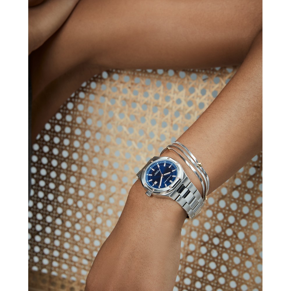 Este modelo femenino de tres agujas con calendario combina caja de acero con tornillos Ip rosa y brazalete de acero, esfera azul con índices claros y agujas en Ip rosa, protegido con cristal mineral resistente. Ideal para el día a día, aporta un toque de estilo a tus looks y combina con cualquier ocasión.
