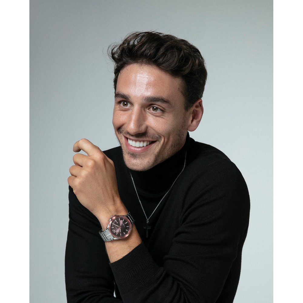 Pack reloj de hombre tres agujas con calendario a las 3 caja bicolor acero Ip rosa con tornillos decorativos en la caja 10 atm y brazalete de acero con esfera gris e indices con agujas horarias en color rosa, cristal mineral. Pulsera de acero de piel marrón