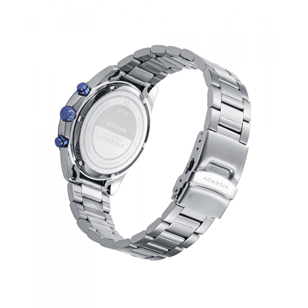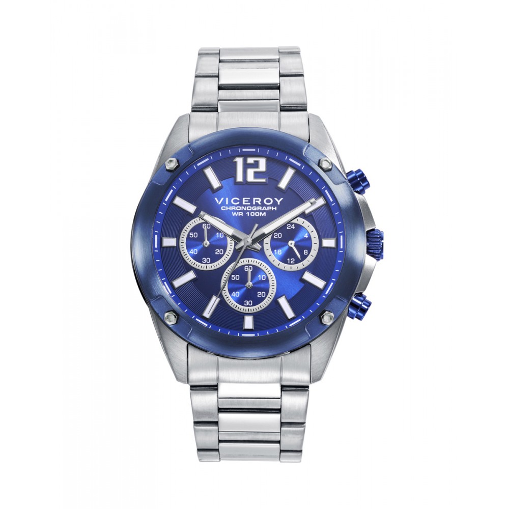 Este reloj de hombre cronógrafo combina elegancia y diseño robusto. La caja de acero, con bisel IP azul y tornillos decorativos, añade un toque distintivo y moderno. El brazalete de acero complementa la esfera azul, que destaca por sus índices y agujas horarias en color plata, así como las contadoras que aportan funcionalidad sin sacrificar el estilo. Consíguelo solo en Viceroy.