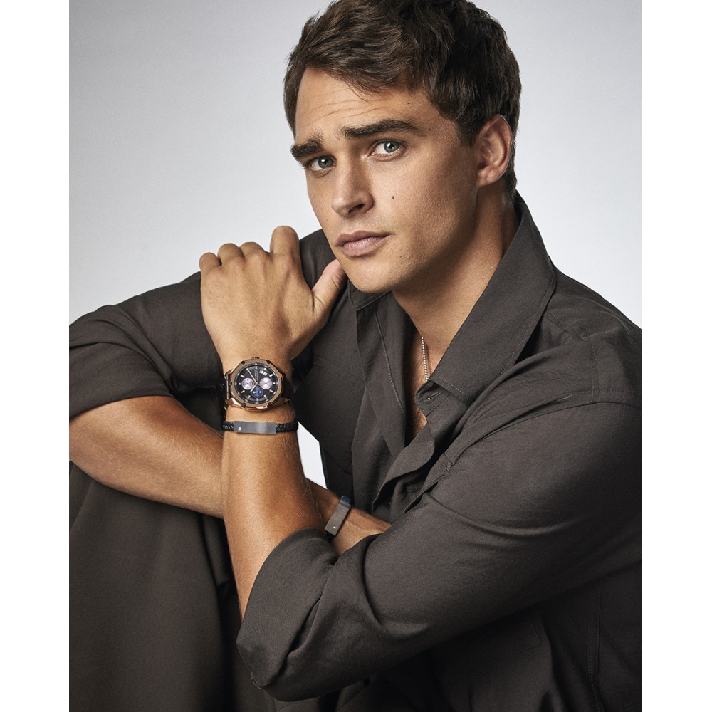 Reloj cronógrafo con calendario abierto desplazado, caja de tres cuerpos en IP rosa combinado con garras y tornillos técnicos en IP negro. Correa de piel marrón con pespunte blanco. Si buscabas un modelo que sobreviva a los tiempos y las modas, estás de suerte. Siente en tu muñeca el poder de lo eterno, de lo perdurable y, por supuesto, infalible. Sumergible 100 metros.