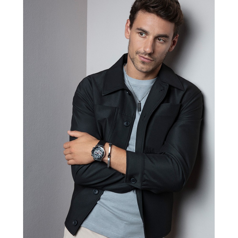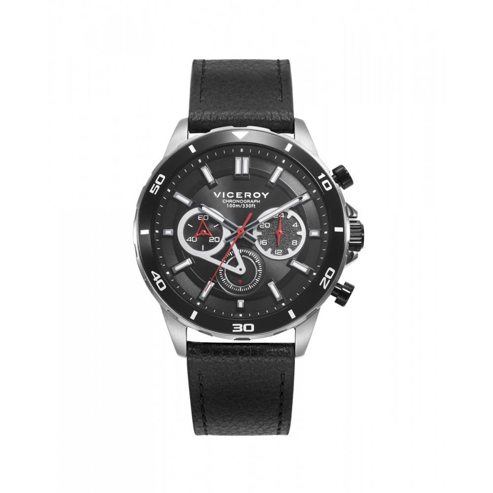 Este reloj de hombre cronógrafo combina estilo y funcionalidad en un diseño elegante y robusto. La caja de acero con bisel de aluminio negro ofrece una apariencia moderna y resistente. La correa de piel negra añade un toque clásico y refinado, mientras que la esfera negra, con índices y agujas de horas en color plata, crea un contraste elegante. Las agujas de segundos y contadoras en color rojo aportan un toque dinámico y deportivo.
