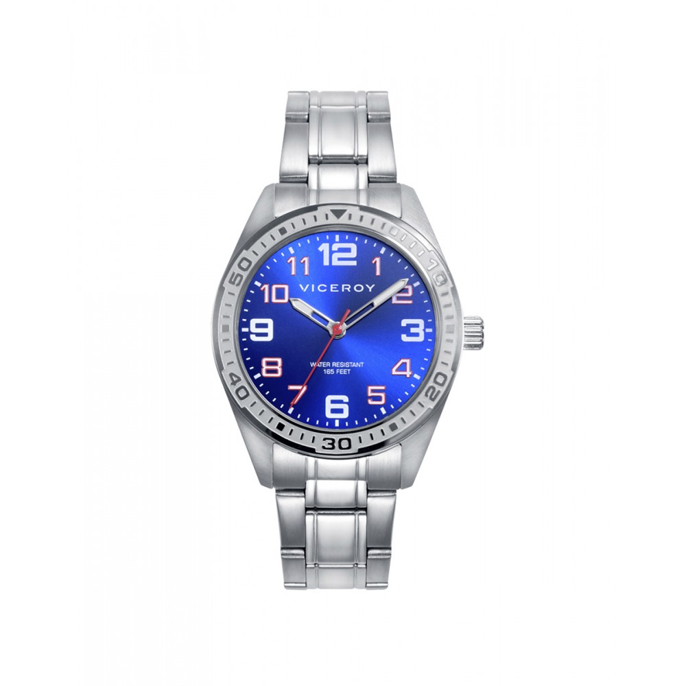 Reloj de acero para niño, con esfera en vibrante color azul, grandes números plateados y segundero en rojo. Todo ello crea un contraste totalmente llamativo, perfecto para darle la última pincelada a su traje de comunión. De regalo con el reloj, una pulsera azul en piel trenzada, completada con una placa de acero y detalles en esmalte. Un pack de Viceroy con el que hacer que su comunión se convierta en el día más especial de su vida.