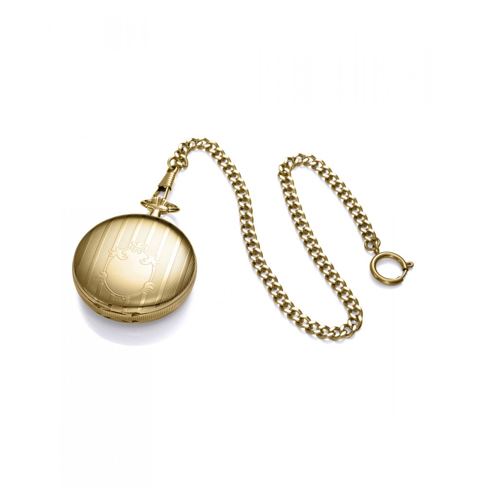 Un reloj de bolsillo mecánico que fusiona lujo y tradición con un diseño impecable. Su caja con acabado IP dorado le otorga un aire sofisticado, mientras que la esfera blanca, decorada con elegantes números romanos, refleja un estilo clásico y refinado. Las agujas horarias en color negro crean un contraste armonioso sobre el fondo claro, complementando el diseño con un toque distintivo.