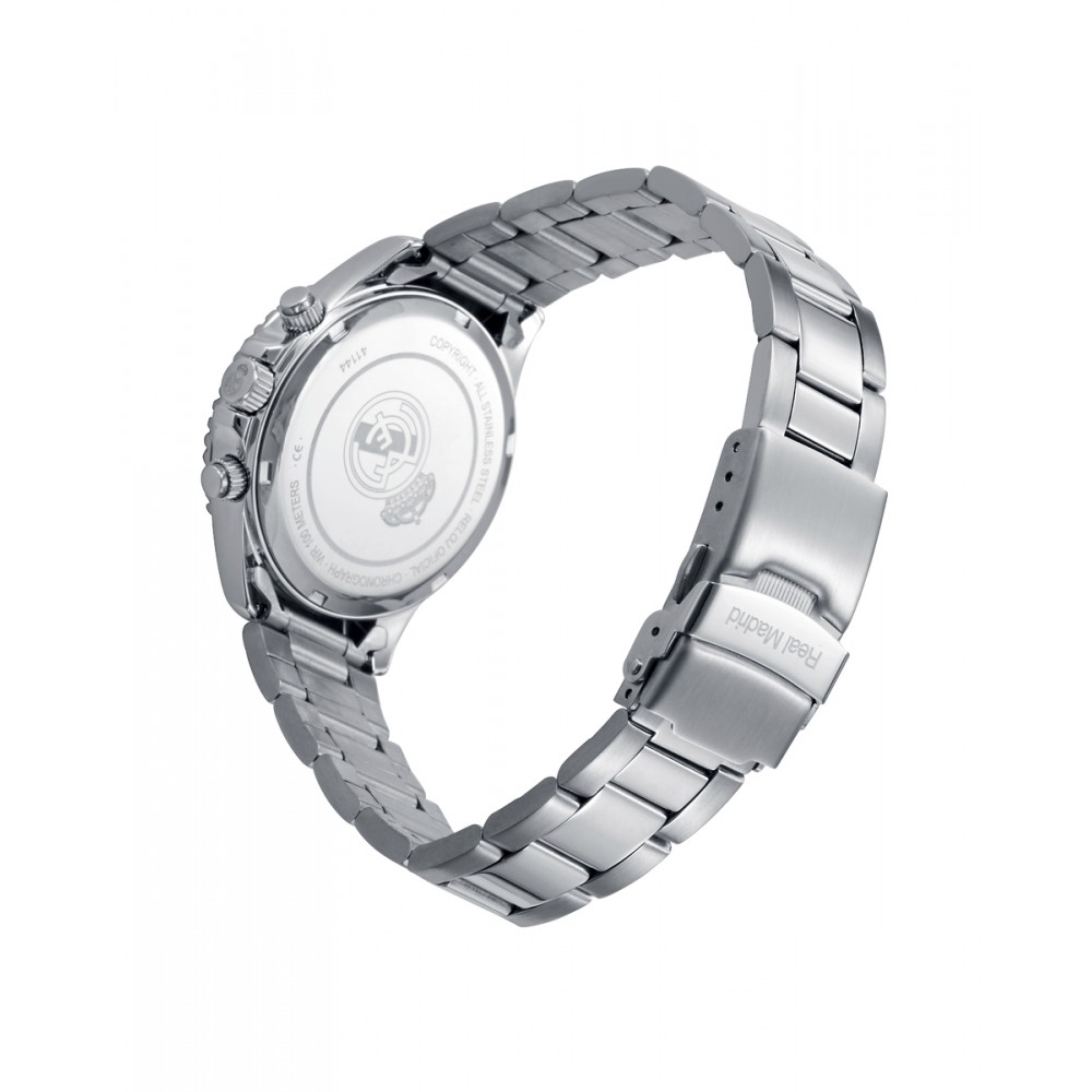 Este reloj cronógrafo de cadete del Real Madrid combina estilo deportivo y funcionalidad, ideal para los jóvenes aficionados al equipo. La caja de acero y el bisel en azul y blanco reflejan los colores del club, mientras que su resistencia al agua de 10 ATM lo convierte en una pieza duradera y versátil. El brazalete de acero complementa la esfera azul, que incluye contadores en blanco y números arábigos para un diseño dinámico y atractivo. Las agujas de horas, segundos y contadores en color naranja aportan un toque vibrante y moderno. Equipado con cristal mineral, este reloj es perfecto para quienes buscan un accesorio resistente que combine su pasión por el Real Madrid con un estilo audaz y juvenil.
