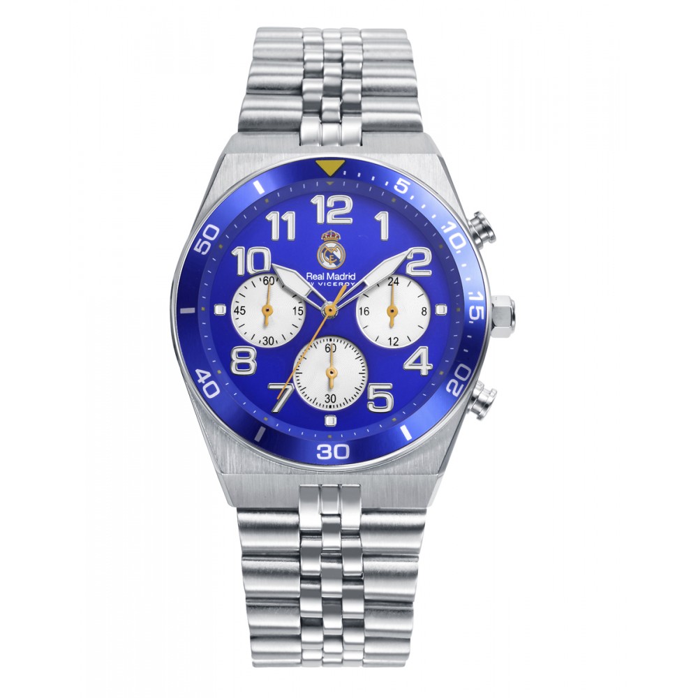 La fuerza del Real Madrid brilla en este cronógrafo para hombre. Caja y brazalete de acero, esfera azul con contadores blancos y toques amarillos en segundero y subesferas. Sus agujas plateadas garantizan precisión, mientras el cristal mineral y la resistencia de 10 ATM lo convierten en un reloj preparado para todo.