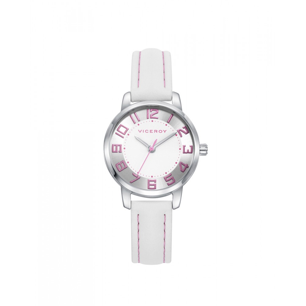 Un precioso reloj con correa blanca realzada con delicados pespuntes rosas, una combinación llena de encanto y contraste. La esfera blanca se realza con un bisel en color plata, y sus grandes números en color rosa permiten una lectura fácil de la hora. De regalo con el reloj, una delicada pulsera rosa adornada con motivo del árbol de la vida en plata de ley, el complemento ideal para ella. Con Viceroy, el día de su primera comunión se convertirá en un momento inolvidable.