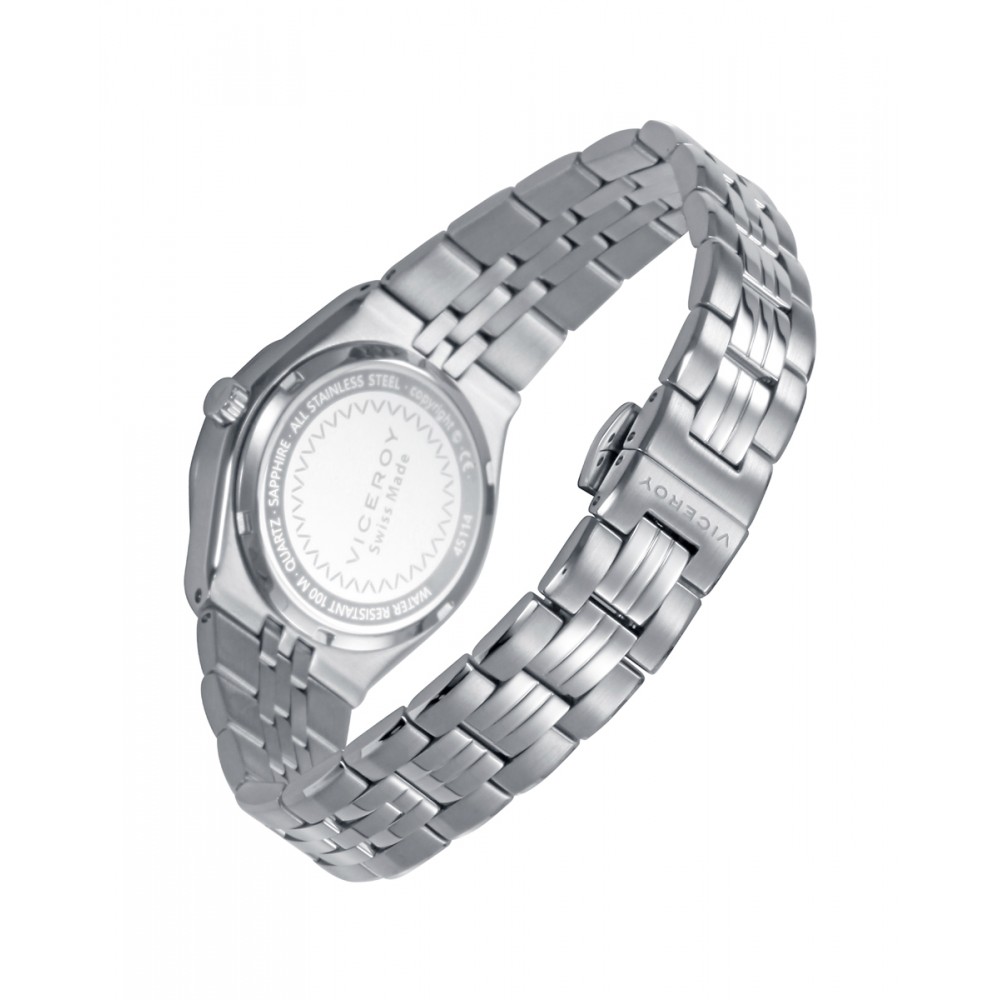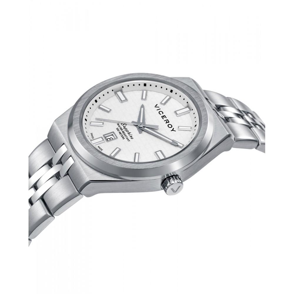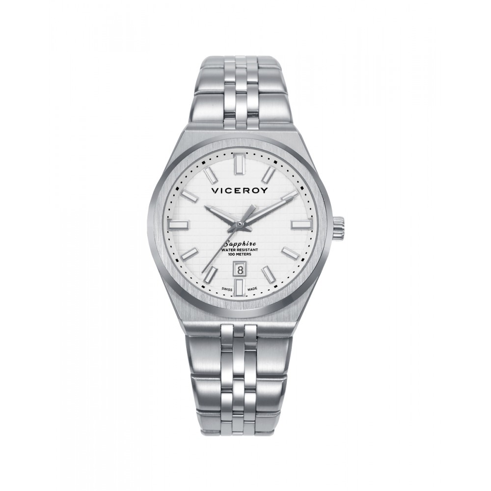Atractivo reloj de mujer Swiss Made con diseño atemporal y precisión impecable. Su esfera blanca con agujas plateadas destaca bajo un resistente cristal de zafiro. Caja de acero 10 ATM y brazalete sólido desmontable que combina estilo y comodidad. Una pieza versátil y sofisticada que refleja la elegancia única de Viceroy.