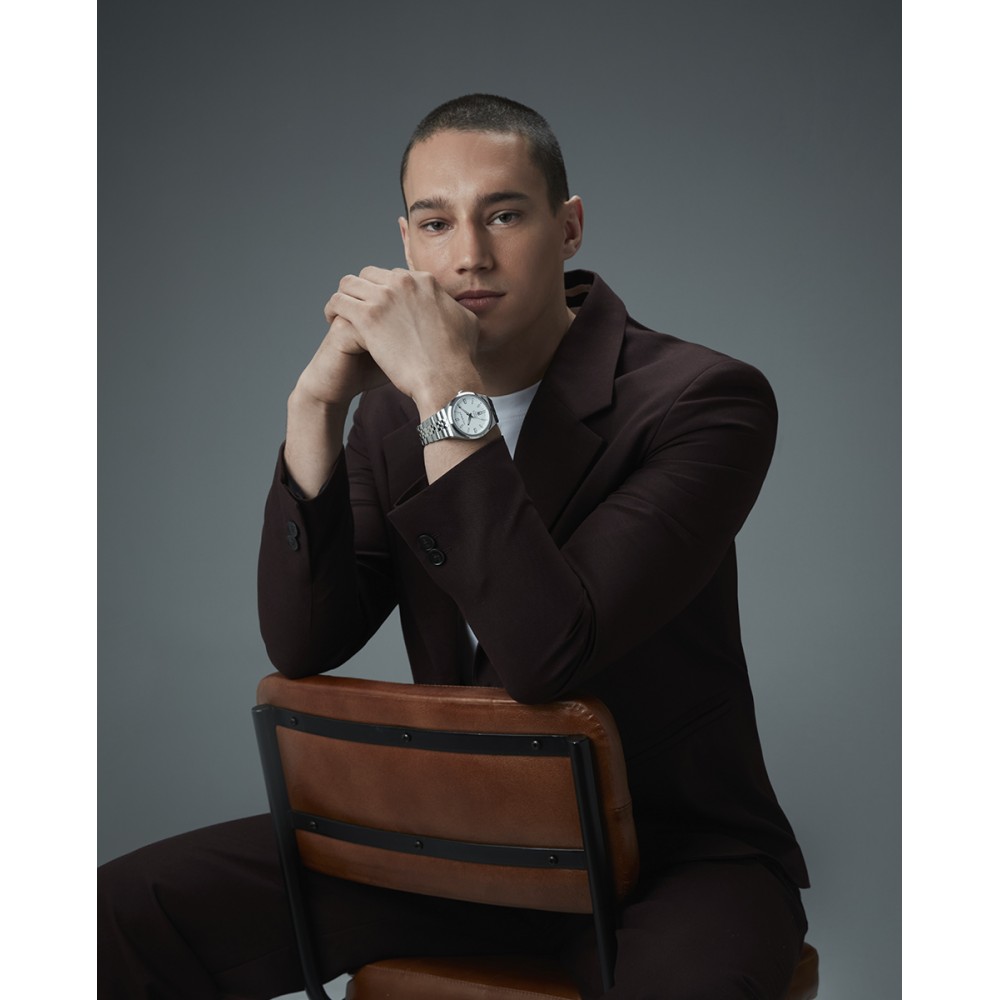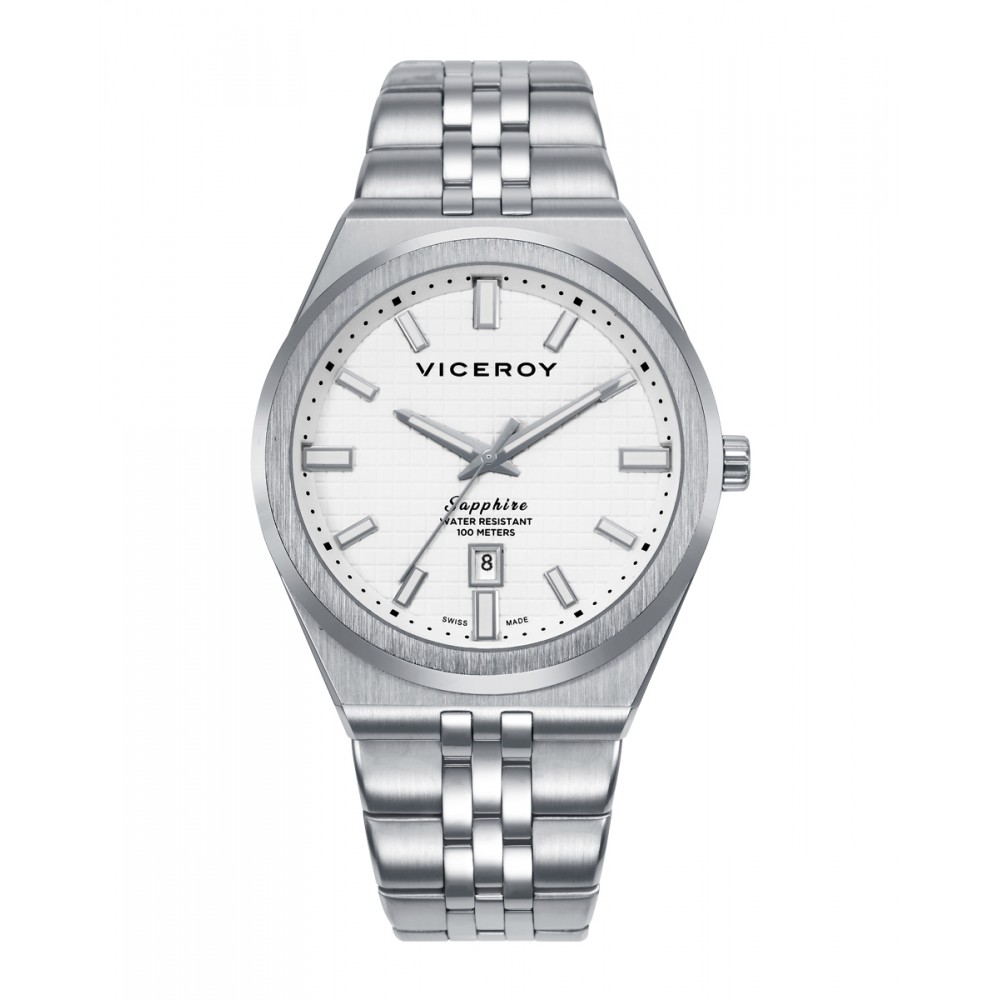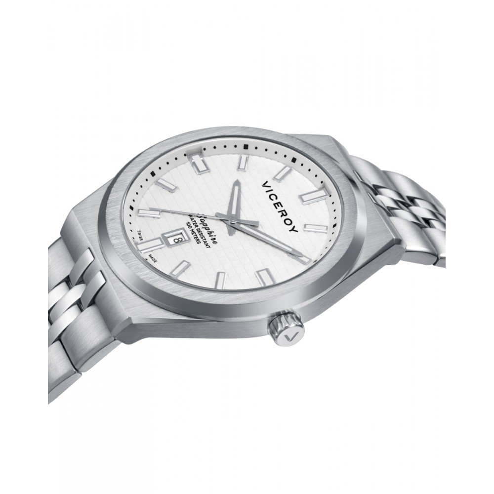 Sólido reloj de hombre Swiss Made con movimiento de tres agujas y calendario. Caja de acero resistente al agua 10 ATM y cristal de zafiro que asegura máxima durabilidad. Su esfera blanca con índices y agujas plateadas transmite elegancia atemporal, mientras que el brazalete sólido desmontable ofrece comodidad y versatilidad. Una pieza única para tu muñeca.