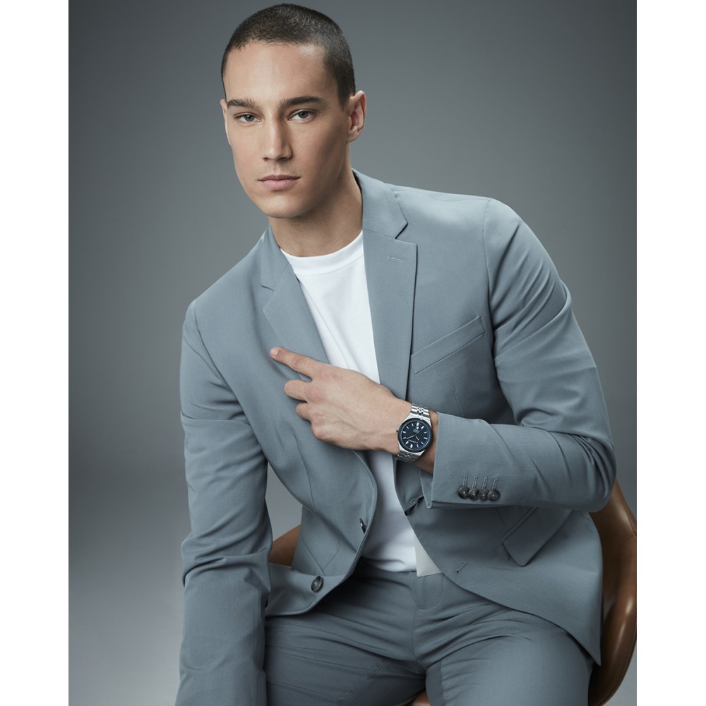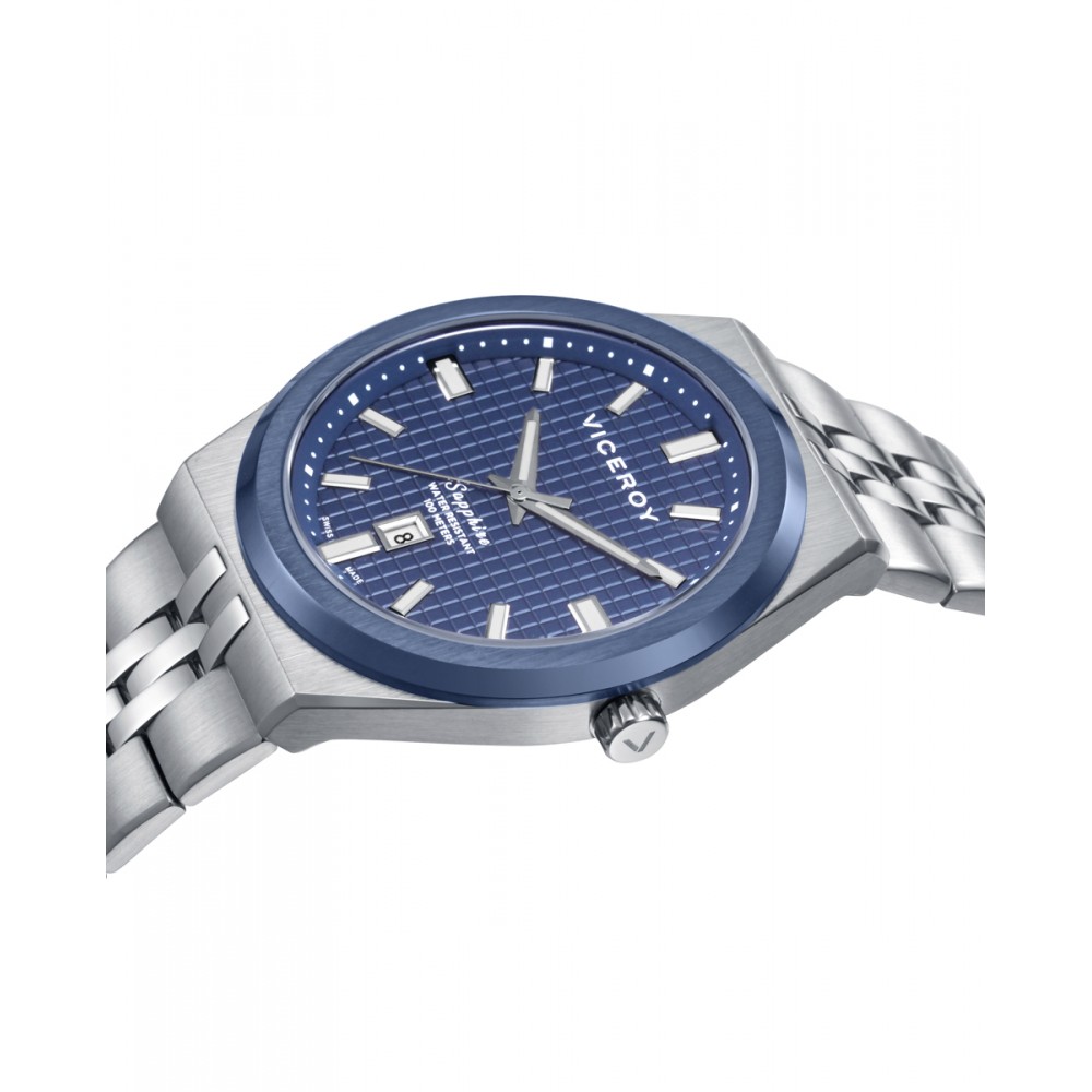 Magnético reloj de hombre Swiss Made con tres agujas y calendario. Destaca por su caja bitono de acero con IP azul y resistencia 10 ATM, combinada con un brazalete sólido desmontable. La esfera azul con índices y agujas plateadas, protegida por cristal de zafiro, refleja la unión entre precisión suiza y estilo Viceroy.