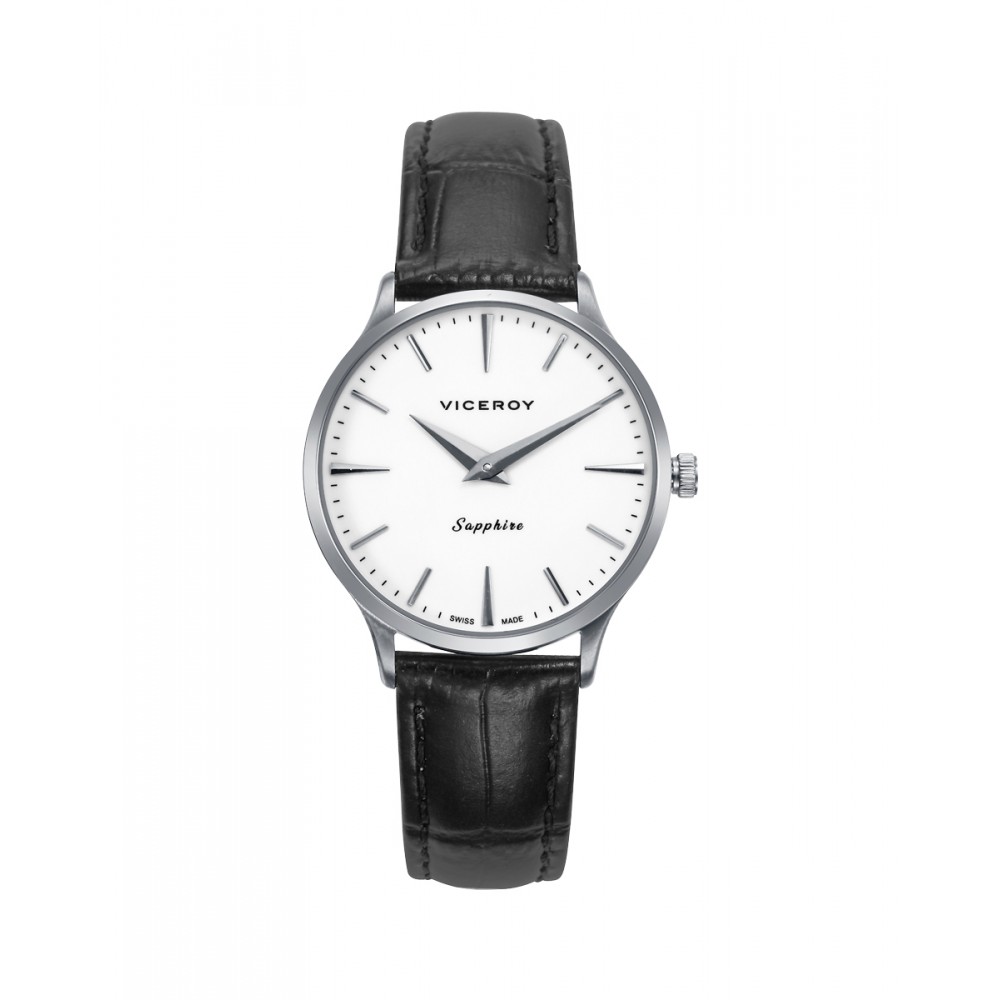 Distintivo reloj de mujer Swiss Made con movimiento de dos agujas y diseño minimalista. Su caja de acero con resistencia 5 ATM y cristal de zafiro garantizan durabilidad. La esfera blanca con índices y agujas plateadas se combina con una correa de piel negra, creando un accesorio elegante y atemporal al estilo Viceroy.